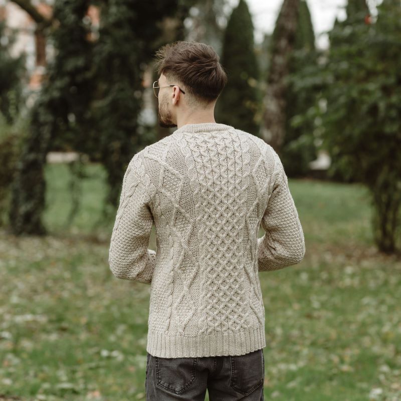 The honeycomb stitch, an emblem of the diligent honey bee, serves as a nod to hard work and dedication. The Aran cable and basket stitch, seamlessly integrated into the material, is steeped in folklore as a harbinger of good luck, intertwining the wearer's life with positive energies. Meanwhile, the moss and diamond stitch, strategically placed, is more than a visual embellishment – it is believed to attract wealth and prosperity, turning the sweater into a wearable charm.