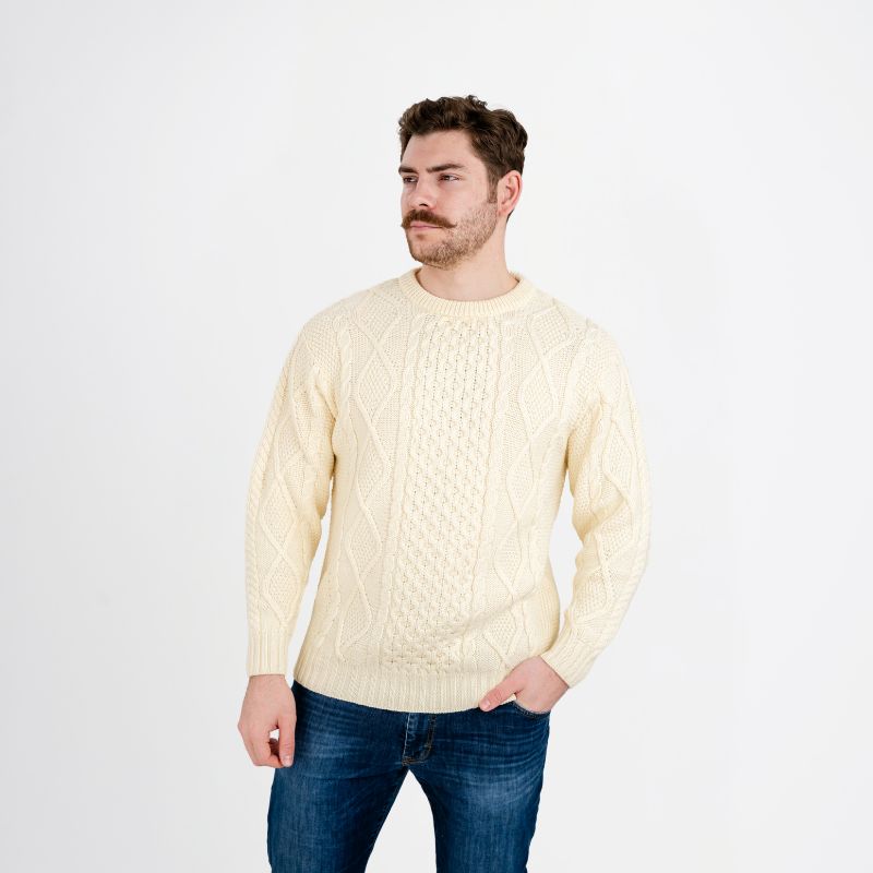 Our iconic, cozy Irish Crew Neck Aran Sweater is a winter staple for both men and women and is guaranteed to keep you safe from icy chills and ocean winds alike. Each Aran sweater we ship is manufactured from brand new, 100% Irish-sourced wool, and absolutely will not fail in its mission to keep you toasty (and looking stylish at the same time). Its incredible durability coupled with its adaptive, timeless style, has led to its steadily increasing popularity around the world. It is by far one of our most popular items and we have made sure to offer an Aran sweater that truly honors the heritage of this classic garment that has been worn for generations in Ireland. Taking its name from the Aran Islands where the first Aran fisherman sweaters were knitted from unscoured wool, these hardy garments have since made a name for themselves as a must-have for Ireland’s coastal fishermen and those who live along its windy coastal shores.