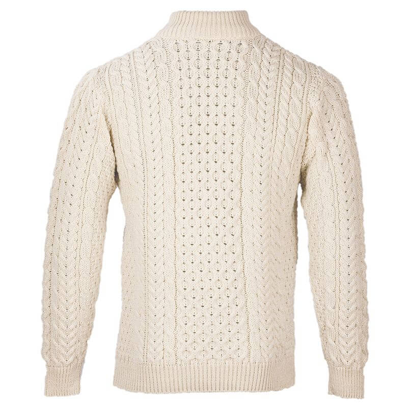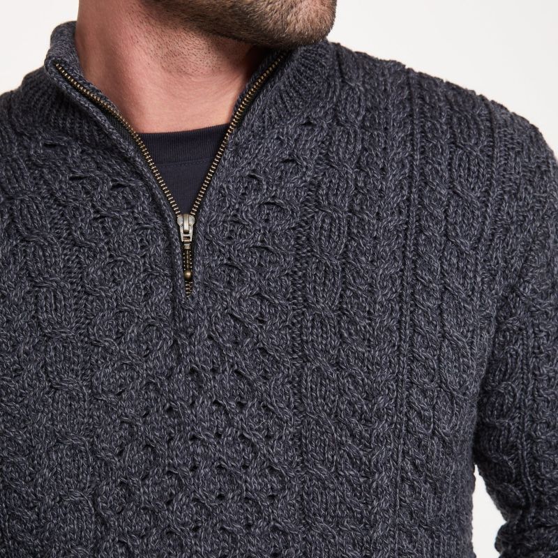 The perfect mix of sportiness, tradition, and masculinity, this Men's Merino Wool Aran 1/2 Zipper Sweater is great for a man who enjoys Irish-style pieces that bring out his rugged edge! This Irish Aran sweater is made of 100% luxuriously soft yet durable Merino wool, a material that is ideal for staying warm in cold weather and cool in hot weather as it's breathable and adaptable, keeping you dry and comfortable. This material is natural and sustainable, and an excellent choice for anyone seeking fashionable and environmentally friendly clothes.