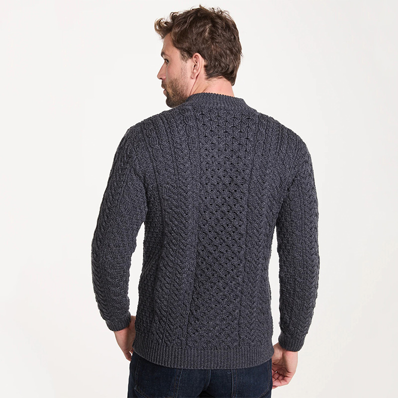 This Irish sweater’s cultural design features the iconic Aran stitches inspired by Aran Island fisherman sweaters, famous since the late 1800s. The design features Aran patterns including basket, cable, and honeycomb stitches adding cultural significance and beauty. Basket patterns represent the baskets of Aran Island fishermen and hope that they would have plentiful catches. Resembling the ropes these fishermen used in their work, the cable patterns signify wishes for safe, fruitful voyages. The intricate honeycomb design honors the dedicated bees of the Aran Islands and symbolizes hard work.