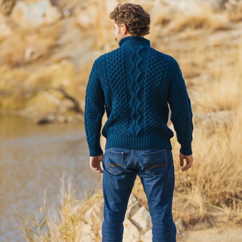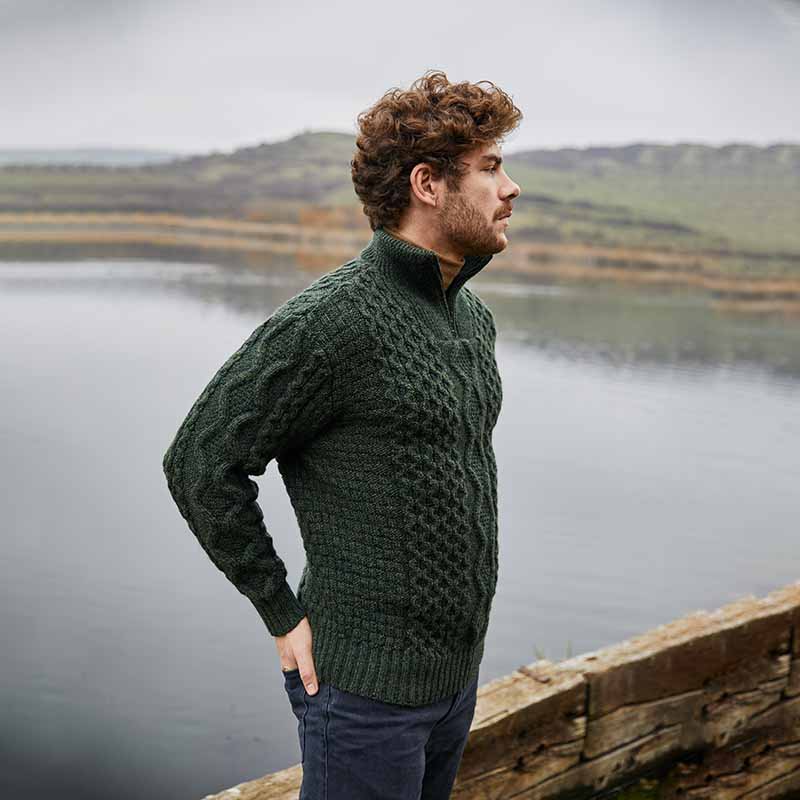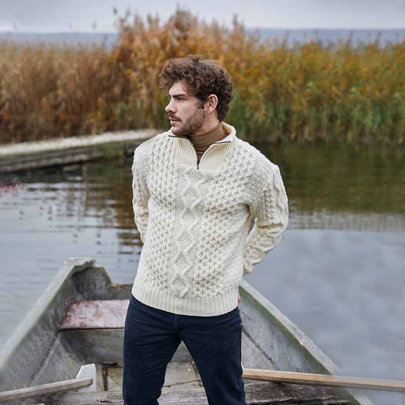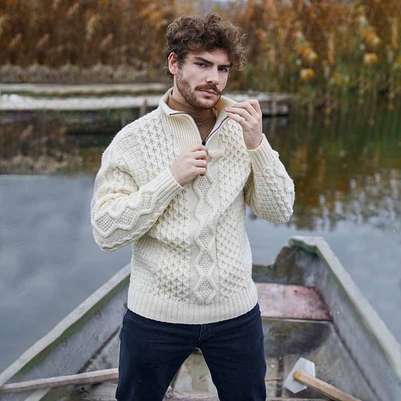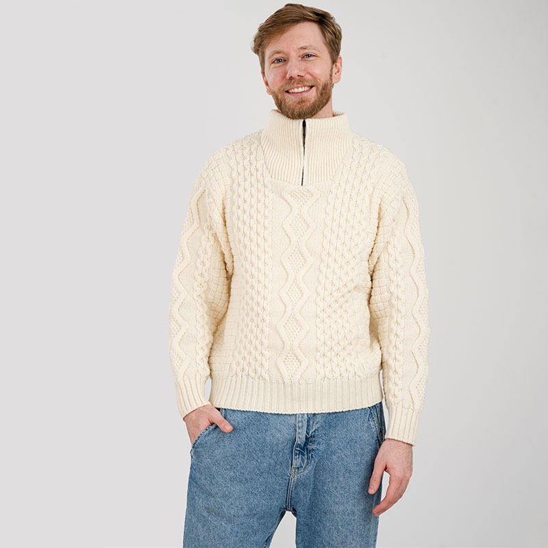 The story behind the design of this garment dates back to the early 20th century when Irish fishermen from the remote Aran Islands wore raw wool sweaters when out on the Atlantic. The richly textured patterns of their sweaters acted as protection against harsh conditions, while allowing air flow to ensure optimal heat insulation. Similarly, the three-dimensional texture of this sweater promises to keep you warm and comfortable. But there's more to these patterns than just functionality, as each stitch tells a story. The honeycomb stitch, featured prominently in this design, reflects bees' devoted nature, as well as the value of hard work and the sweet benefits that come with it. Moss stitches stand for prosperity and success, while the basket stitch mirrors the baskets of the fishermen and symbolizes wishes for a big catch. This sweater showcases a timeless design complete with modern elements, bringing a unique Irish flair to any outfit. It features a chic half-zipper that you can easily adjust, offering both style and versatility.