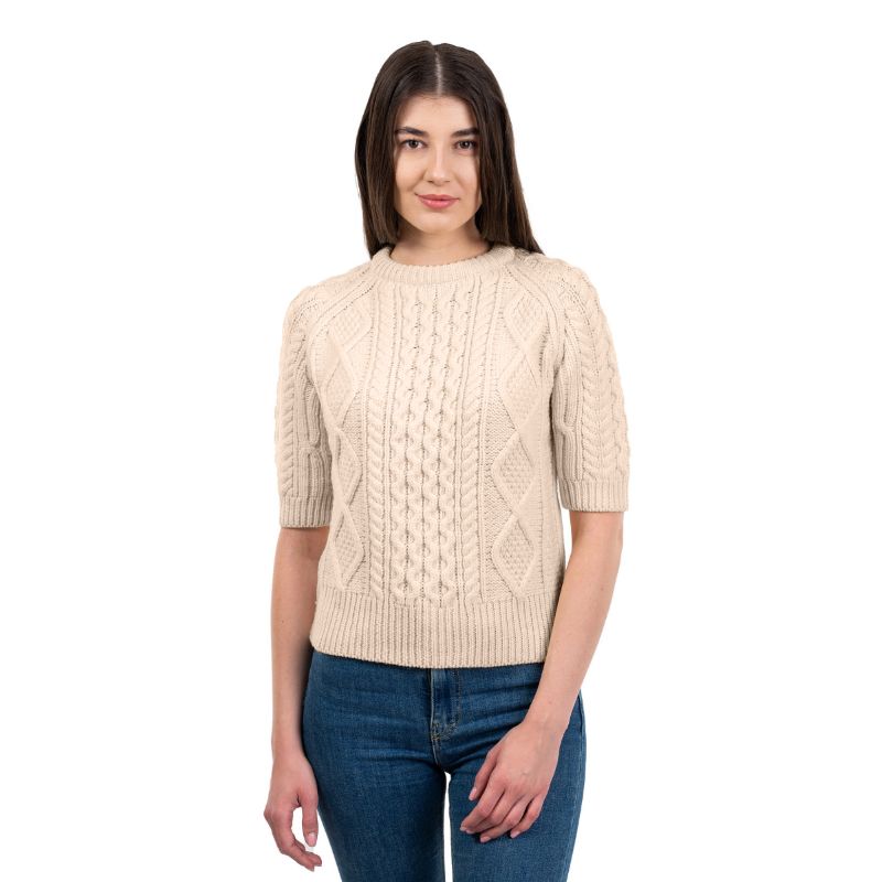 The sweater also has a sleek design with short sleeves and an elegant round neck. It’s a versatile look perfect for both casual and more formal occasions.