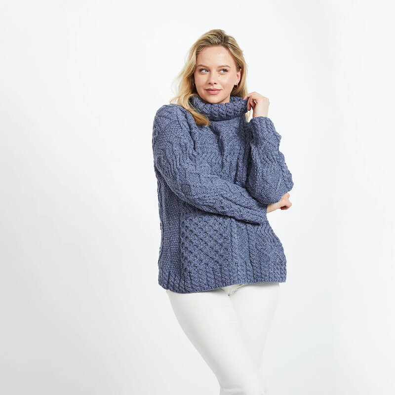 Besides being very comfortable, our ladies Irish sweaters made in Ireland are also beautiful pieces to play around and upgrade your style with. Our sweater fits perfectly with a multitude of outfits, from casual to formal, but it also carries cultural significance, being knitted in honor of the traditional Irish Aran sweaters. The Aran sweater was first knit on the Aran Islands during the 19th century. It was made by the wives and daughters of the fishermen, with the purpose of keeping their husbands and fathers protected from the unforgiving winter at sea. Since then, these sweaters became staples of fashion, carrying the cultural baggage of Ireland throughout the centuries. This piece right here encapsulates heritage in an authentic manner, being knit with a combination of stitches, including cable, honeycomb, Aran, moss, diamond, and other geometrical textures in a variety of forms.