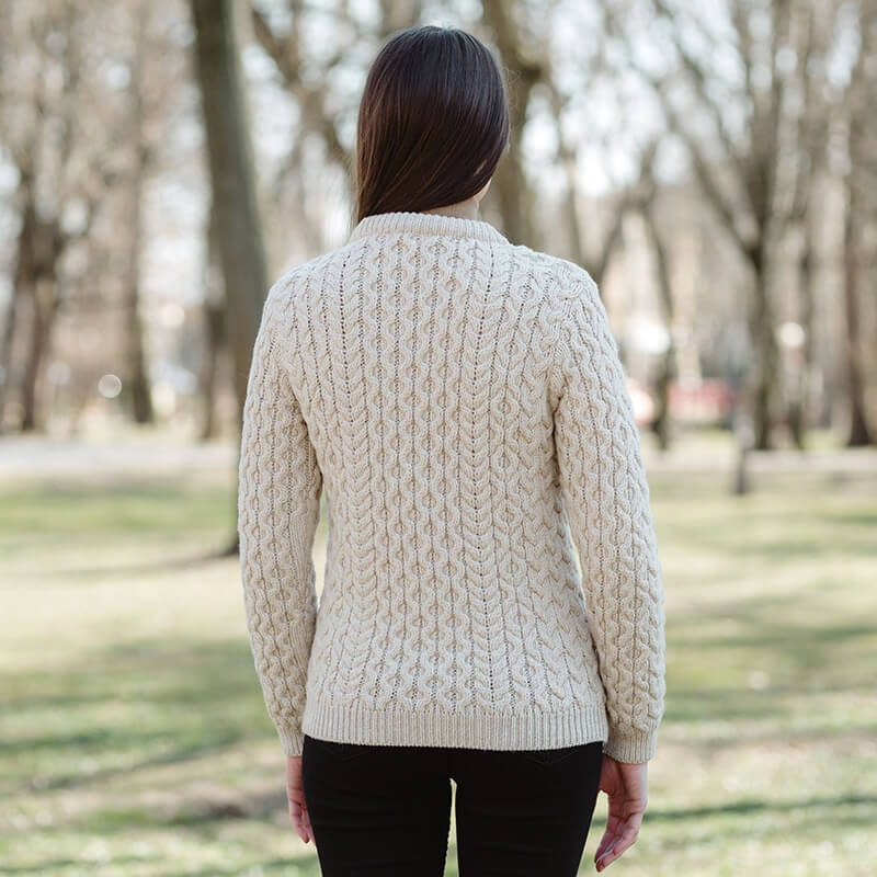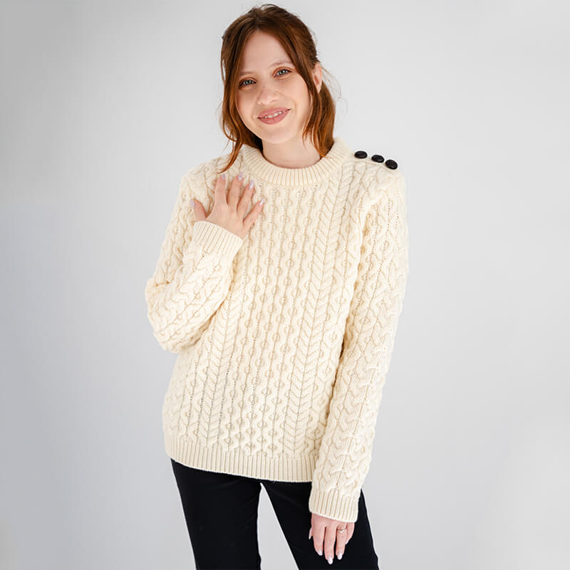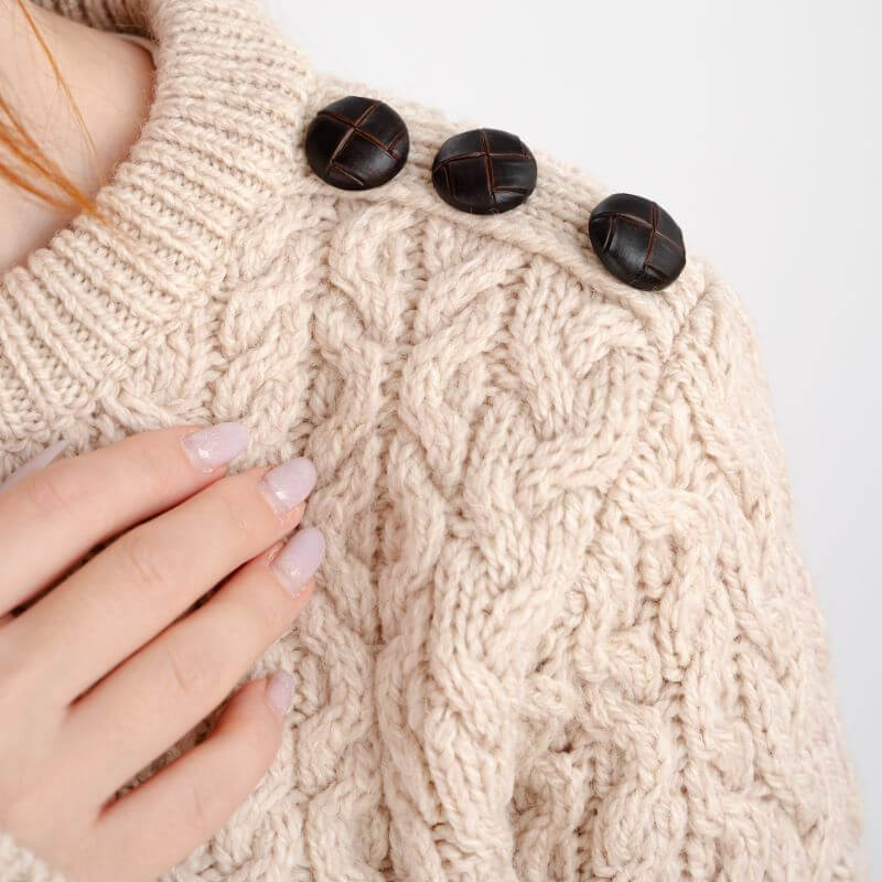 This sweater is intricately designed with Aran stitches arranged in complex patterns that exude elegance and sophistication. Dating back to the 19th century, firstly used by the wives of fishermen in the Aran Islands, the cable stitch represents good luck.