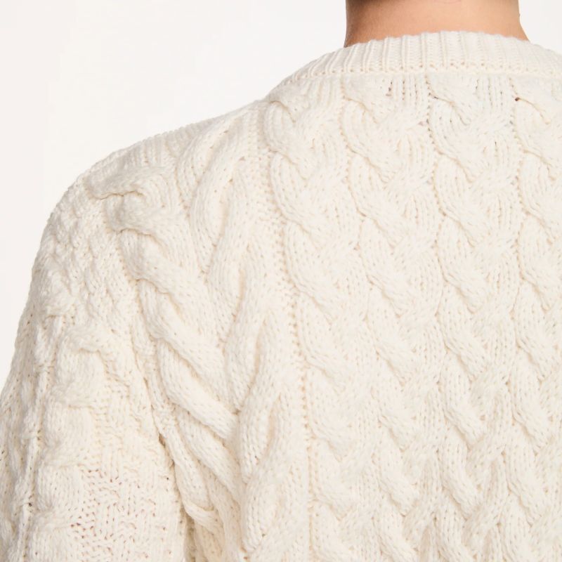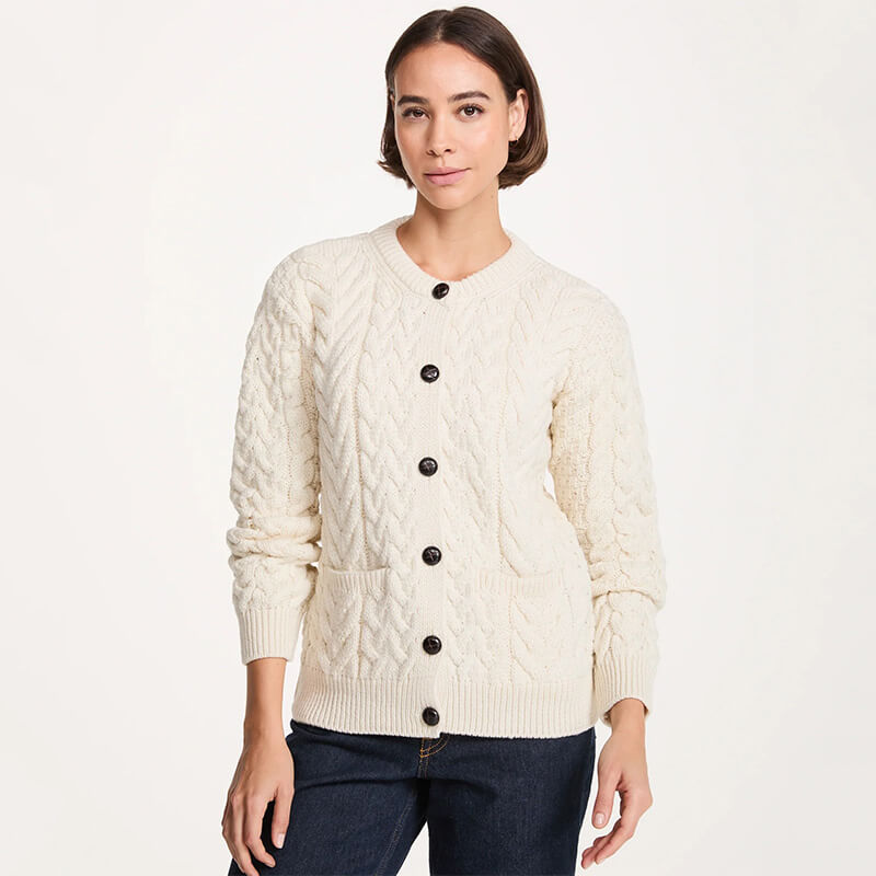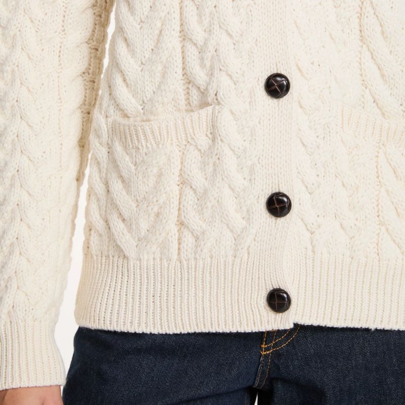 The cardigan also includes seven large, brown football buttons lining the heavy ribbed placket, adding a more traditional look as well as a level of depth and character that is unique when compared to our other Aran sweater offerings. Additionally, the heavy ribbed trim along the cuffs, hem, and crew-neck collar add an extra level of comfort, warmth, and durability to this cardigan that are sure to make it a favorite for those in want of a new standby sweater. The casual yet sophisticated look of the supersoft cardigan makes it timeless and versatile, and it will feel familiar and comfortable like an old favorite from the moment you first put it on. Although style was not necessarily the primary objective of the fishermen’s wives who knitted the first Aran sweaters in the 1890s, their hard work and determination to keep their husbands dry, safe, and comfortable on their perilous fishing expeditions around Ireland’s Atlantic coast. Nevertheless, the Aran sweater became one of the country’s most important contributions to the fashion world, and not just in terms of utility.