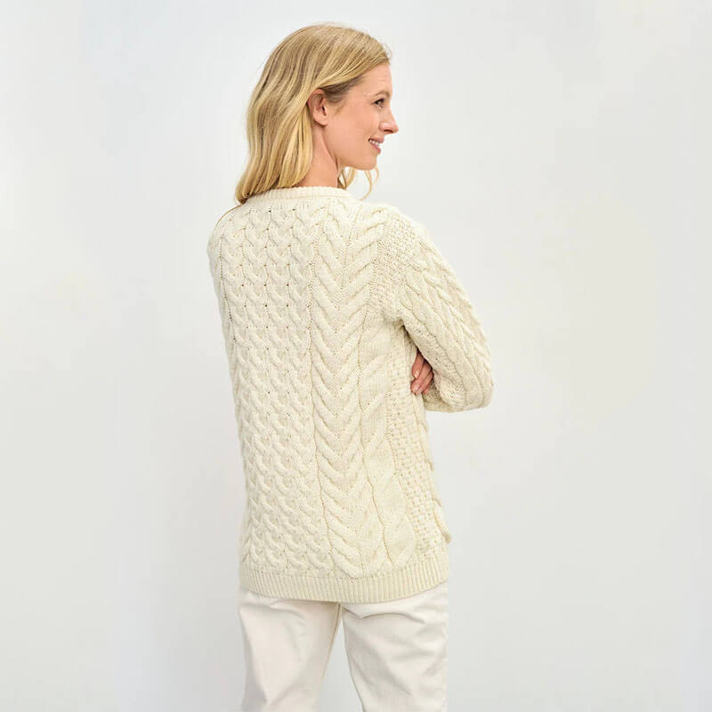 The cozy, knitted crew neck offers various layering possibilities, whether over an elegant blouse, dress, or casual T-shirt, as well as under a jacket or trench coat for the winter. You can perfectly style this ladies’ Aran sweater with a matching Aran scarf or beanie for the ultimate Irish look. The ribbed cuffs and hemline offer extra protection against the cold and they will keep you cozy and stylish all year long. Make this timeless Aran sweater a gift for yourself or anyone special in your life who appreciates quality, craftsmanship, and the heritage of the Emerald Isle!