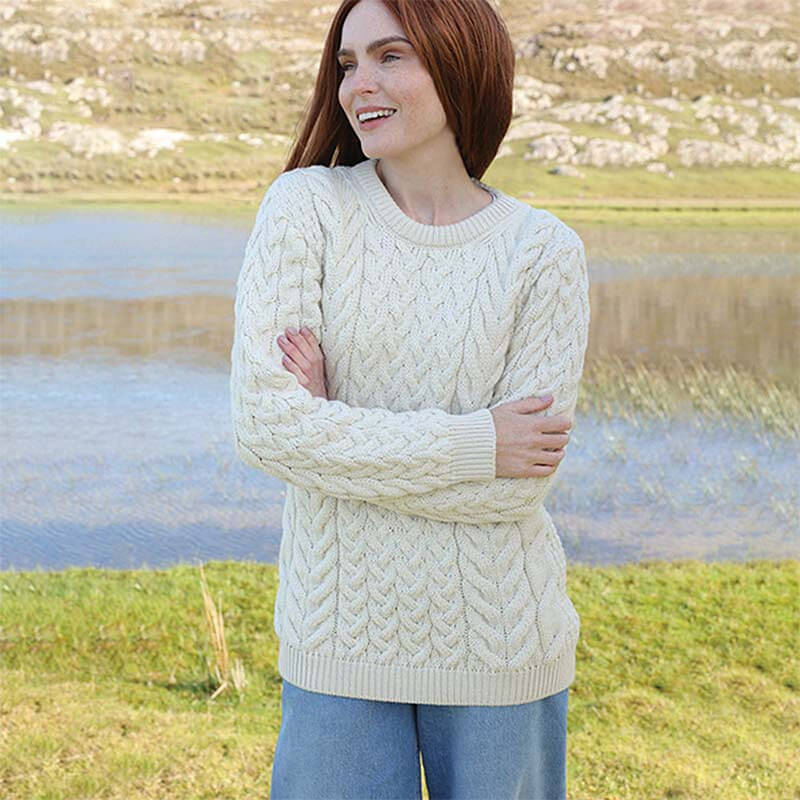 If you are looking for the ideal knitted, culturally-significant piece for this year’s wardrobe, look no further than our Supersoft Wool Cable & Weave Aran Knit Crew Ladies Sweater. This sweater is crafted from 100% Supersoft Merino wool, an organic material with great heat-insulating properties. It ensures to keep you cozy during cold seasons and perfectly cool during warmer ones, as the fibers draw away moisture from the skin. This type of wool is sustainable, as it is highly durable and requires less washing. Our sweater is perfect for year-round wear, making an eco-friendly choice, great for your next capsule wardrobe.