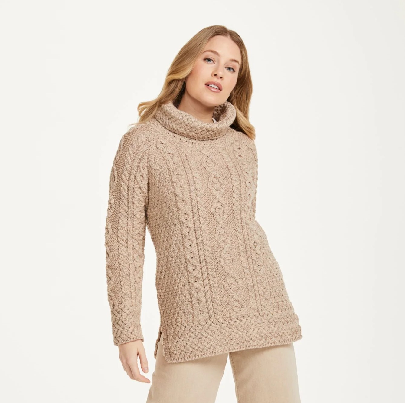 The style of the seater is unique, giving it a stellar, stunning finishing and touch that stands out even in a crowd. The soft roll neck collar guarantees warmth and uniqueness and is cozy and comfortable. Team with one of our Irish wool hats and bags to complete the look.