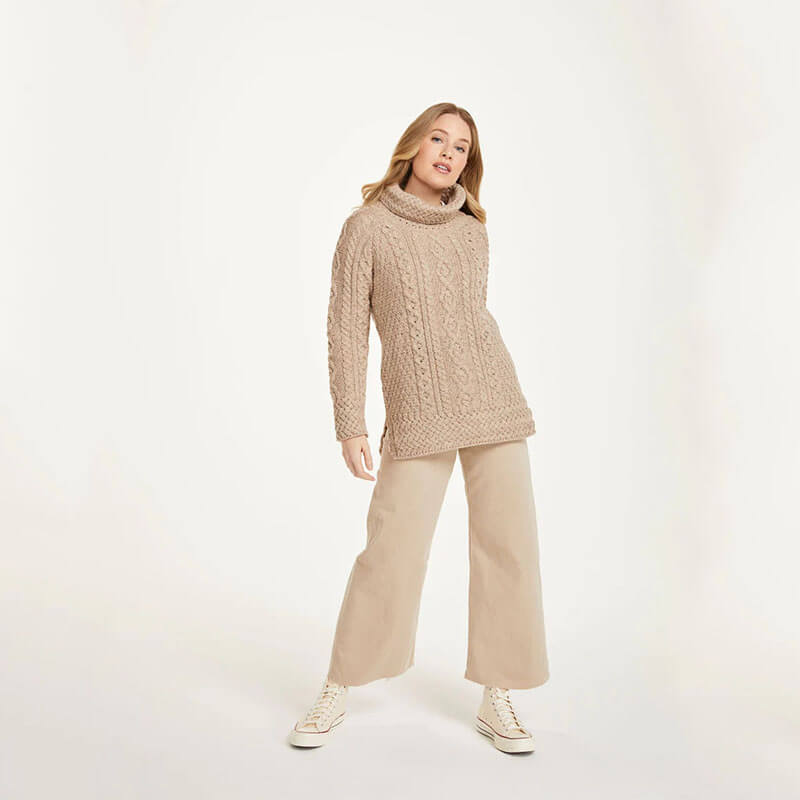 The style of the seater is unique, giving it a stellar, stunning finishing and touch that stands out even in a crowd. The soft roll neck collar guarantees warmth and uniqueness and is cozy and comfortable. Team with one of our Irish wool hats and bags to complete the look.