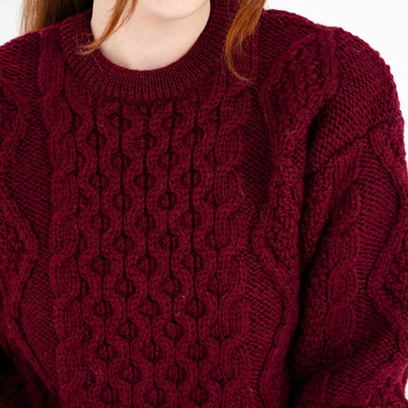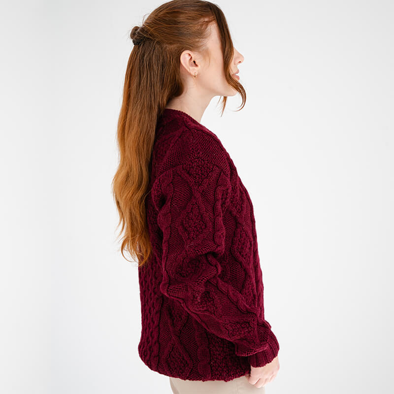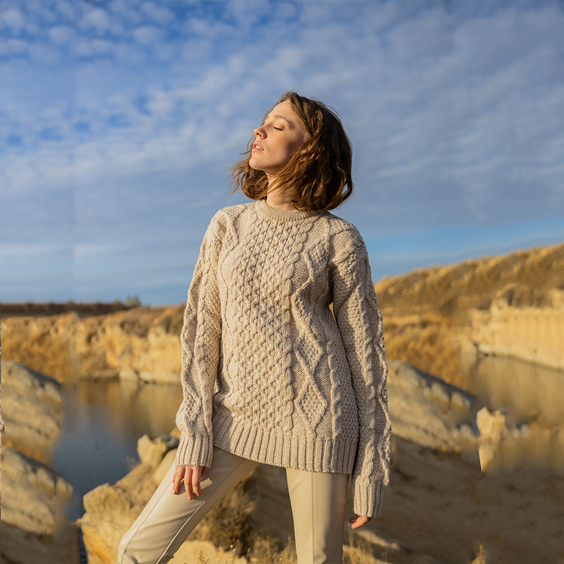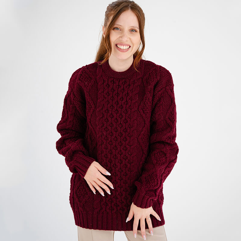 Discover the allure of timeless Irish tradition with our Women's Heavyweight Traditional Aran Wool Sweater. Crafted with meticulous attention to detail, this exceptional garment is made of 100% Fisherman Wool, celebrated for its remarkable thickness, sustainability, and unparalleled warmth, ensuring enduring comfort and durability. What truly distinguishes this sweater is the incorporation of intricate Irish Aran stitches, each artfully woven to convey centuries-old symbolism.