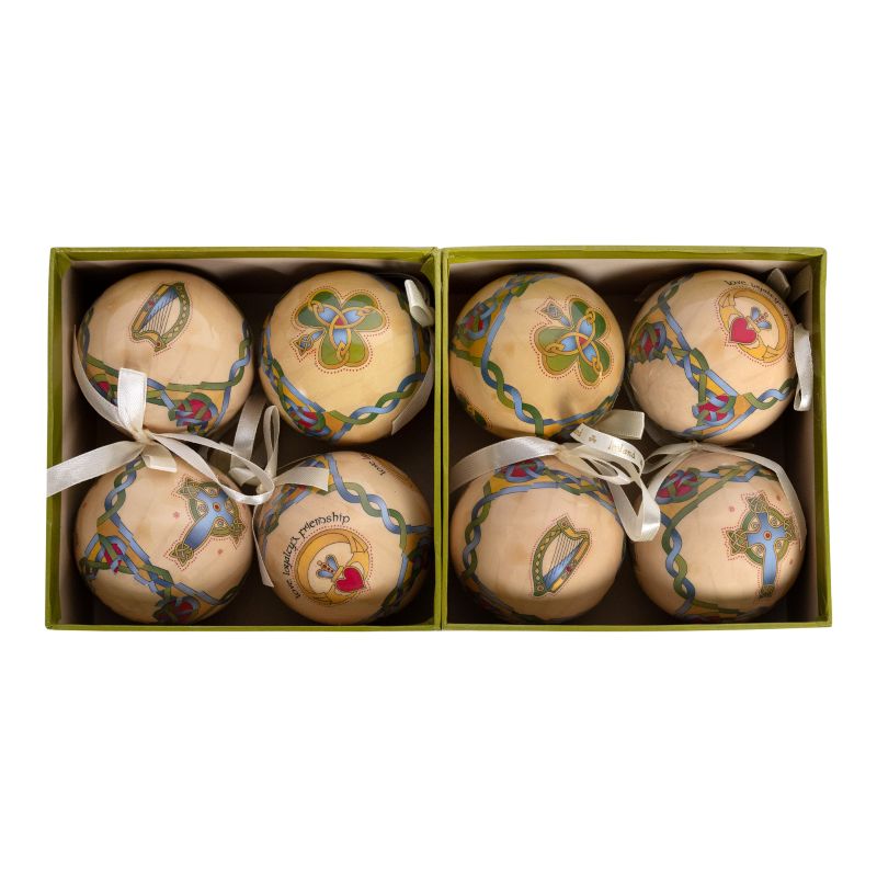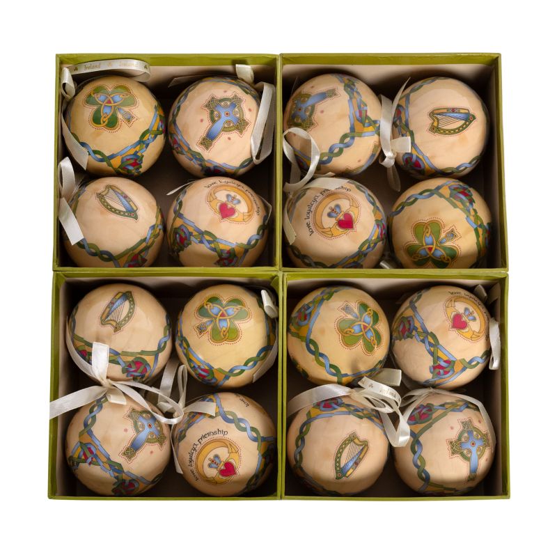 Bring the magic of Ireland to your festive décor with our Hat Box of 4 Irish Weave Gloss Baubles – a set that beautifully blends tradition, color, and craftsmanship. Each bauble features a cherished Irish symbol: the Claddagh Ring for love, loyalty, and friendship; the Shamrock, Ireland’s timeless emblem of faith; the Celtic Cross, representing eternity and heritage; and the Irish Harp, the country’s national symbol of pride and spirit. Together, they tell a story of Irish identity that shines from every angle.