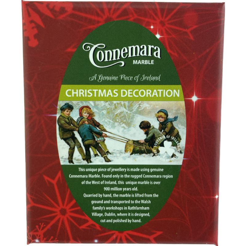 Make this holiday season feel more Irish with our Genuine Irish Designed Connemara Marble Christmas Ornament! A genuine piece of the Emerald Isle and a gift from Mother Nature, this special hanging decoration is 100% rare Connemara marble, ethically sourced and hand-lifted from quarries located in the Connemara region of Ireland. It’s skillfuly designed, cut, and polished by hand in Dublin– no two pieces are identical, and each product has its own unique variations in colors and patterns.