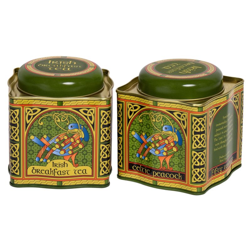 This set offers 50 teabags of Clara gold blend tea. This tea is a blend of black tea with ingredients from Mount Kenya, Assam in India, and Rwanda. These 50 tea bags come in a beautiful olive green tin that is adorned with a peacock and Celtic knots.