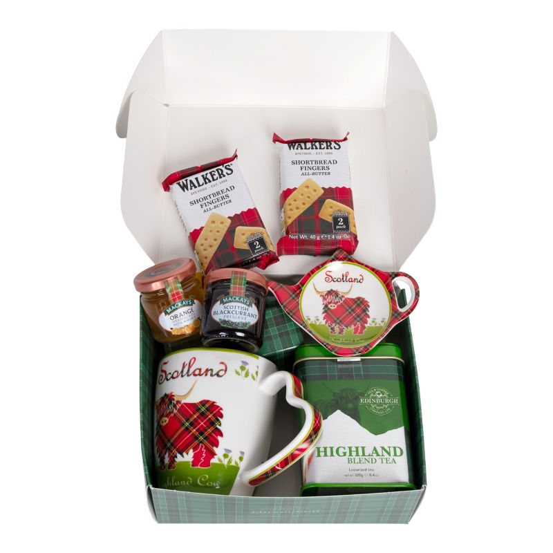 There’s something incredibly comforting about sitting down with a cup of tea and a few small treats, and our Afternoon Scottish Treats capture that feeling perfectly. It starts with a tin of Highland Blend loose-leaf tea, 4.4 ounces of rich, earthy flavor that brews into one of those cups that just settles you. And because tea always tastes better with something sweet, the set includes a little pack of Walkers shortbread fingers (0.84 oz), along with two Mackay’s jams: a bright Orange Marmalade with a hint of whisky, and a deep, fruity Scottish Blackcurrant. It all comes nestled in a green tartan box decorated with a Highland cow, the kind of box you end up keeping because it’s simply too charming to toss.