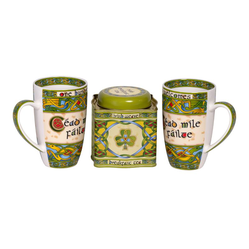 If you love to start your day with a strong kick and celebrate Irish heritage all at the same time, choose our Cead Mile Failte Mug & Irish Breakfast Tea Gift Set! This bundle consists of a mug (or why not, opt for the version with two mugs – one for you and one for your partner) and authentic Irish breakfast tea (50 teabags included). Both the tin and the mug are matching, featuring Celtic-style fonts and backgrounds, inspired from the Book of Kells. The mug features the beloved Irish Gaelic phrase ‘Cead Mile Failte’, translated as ‘a hundred thousand welcomes’ (as written on the upper part of the mug), adding some Irish hospitality and warmth to your routine. Plus, the mug is carefully printed with intricate swirl and Celtic details, symbols of the interconnectivity of all things in the universe.