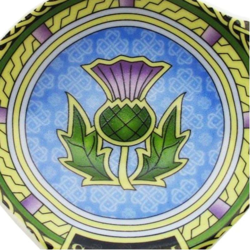 A colorful design decorates this teabag holder, starting with a Scottish Thistle at the center against a blue backdrop, creating a window effect. The Scottish Thistle is the national flower of Scotland. Adorning the perimeter of this piece are gold Celtic Knots with black backgrounds along with gold zigzag patterns accented with touches of blue and purple.