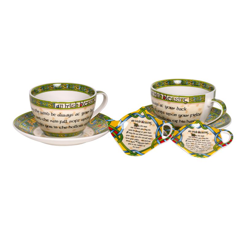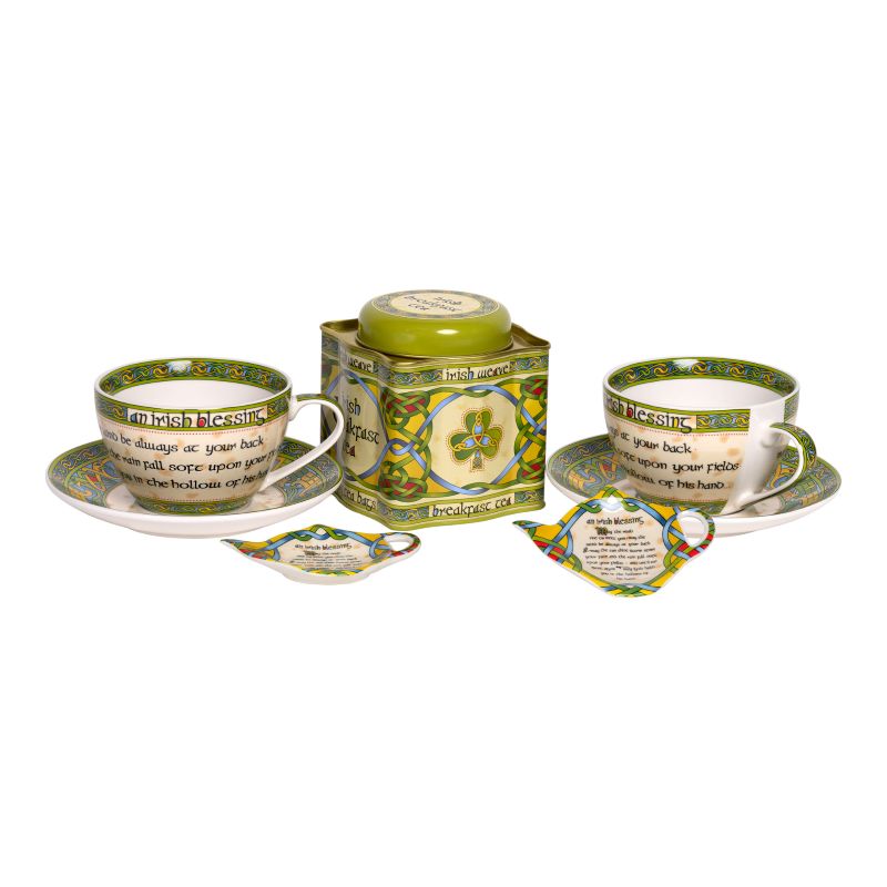 Make your tea sessions even more special with our Ancient Irish Blessing Celtic Tea Set! This collection has everything you need for the best tea party, whether it’s an intimate tea session with your partner, a fun get-together with your friends, or a cozy evening by yourself. We provide a fine selection of products from a cup with its saucer to a complete bundle of 2 mugs, 2 tea bag holders, 2 saucers, and 2 tins of breakfast tea – you choose according to your needs!