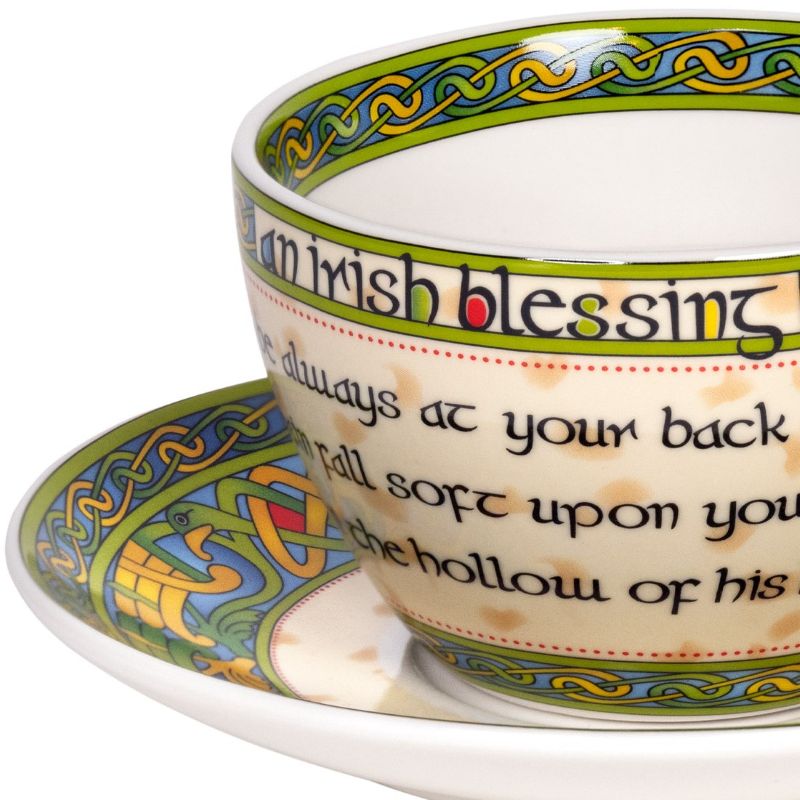 The matching set features an inspiring Irish blessing written in an elegant Celtic script. The inscription reads: "May the road rise to meet you, May the wind be always at your back, May the sun shine warm upon your face and the rain fall softly on your fields, and until we meet again may God hold you in the hollow of his hand." Additionally, it’s decorated with richly-colored Celtic motifs reminiscent of the illustrations found in the Book of Kells. The cup is printed inside & out, so you can enjoy the bright design from every angle. Even the tea tin has a charming matching design that looks just like a medieval manuscript – why not use it as an inspiring Irish souvenir after you have finished your tea?