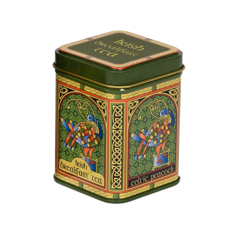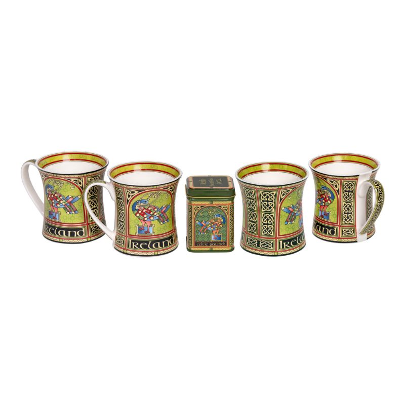 Celebrate timeless artistry and rich flavor with the Celtic Peacock Mugs Set with Irish Breakfast Tea, a thoughtfully curated collection for tea lovers. This customizable set lets you choose up to four matching mugs paired with a tin of our classic Irish breakfast tea, creating a perfect balance of beauty and tradition. Each piece features the same Celtic Peacock design inspired by the illuminated illustrations of the Book of Kells. In Celtic symbolism, the peacock represents immortality and foresight, while the surrounding colorful knots and swirling patterns reflect interconnectedness and eternity.