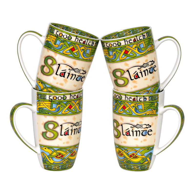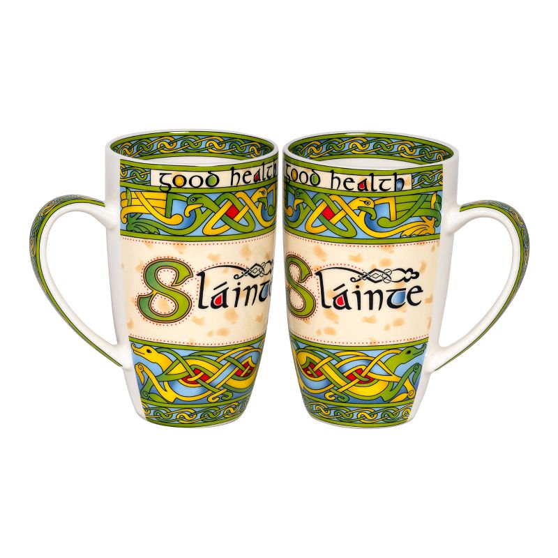 Decorating the top and bottom of the mug including the interior and handle are striking green and yellow swirl patterns that bring dynamic style to the mug. Adorning the outside of the mug are intricate illustrations in vibrant tones of yellow, red, blue, and green – just like those in the Book of Kells. Across the center of the mug is the word “Slainte” in multi-color accented Celtic lettering. The Irish Gaelic word “Slainte” means “good health” which is also displayed at the top of the mug. If you like this Irish Weave design, check out more of our Irish coffee mugs, starting with this matching Irish Blessing Mug!