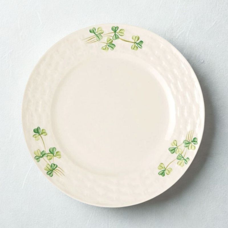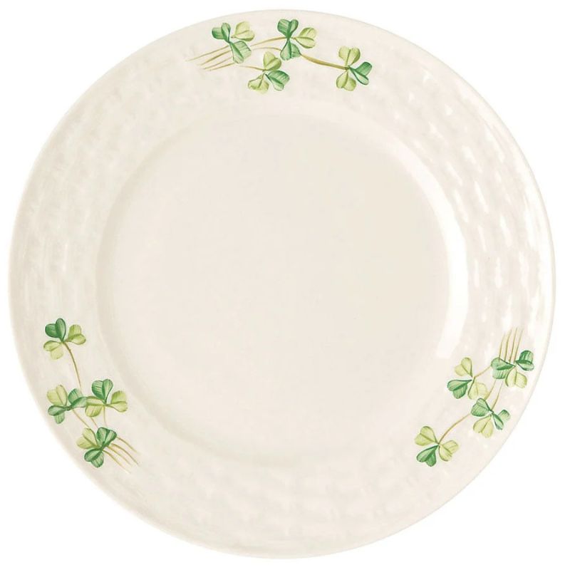 Our Belleek Basketweave Dinner Side Plate feels familiar and traditionaș. The baske tweave design goes all the way back to the 1880s and was inspired by the wicker baskets that were once everywhere in Ireland, carried to markets, used in kitchens, and woven by hand in towns and countryside alike. The shamrocks are handpainted into the design in a way that feels unique, with their stems forming gentle curves and details instead of simply sitting on the surface.