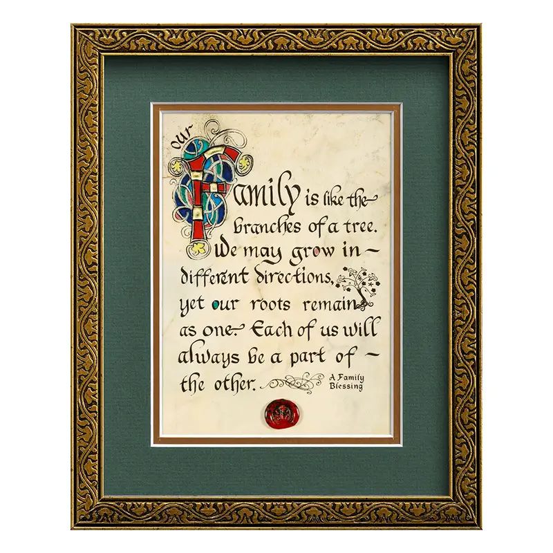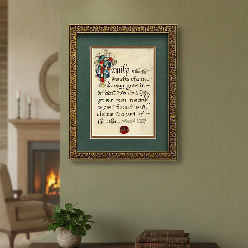 Enhance the decor of any room with this stunning Celtic artwork piece displaying illuminated calligraphy reminiscent of the style of medieval manuscripts. The print displays a beautiful text that is a tribute to the long-lasting connection of family: “Our family is like the branches of a tree. We may grow in different directions, yet our roots remain as one. Each of us will always be a part of the other”.