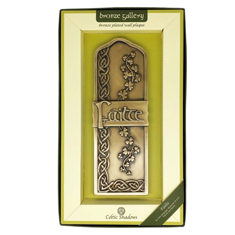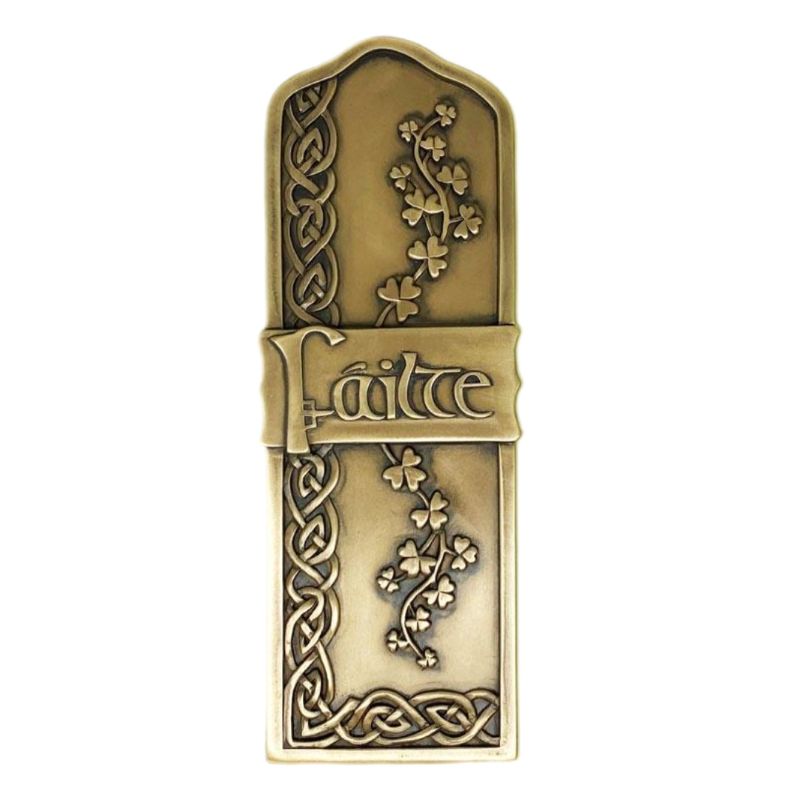 Make your loved ones feel at home with our “Failte - Welcome'' plaque. Elegantly plated with bronze, a highly-durable, corrosion and rust-resistant material, this beautiful plaque has a refined and timeless appearance of warm golden color, being sure to last for ages. The authentic “Failte '' inscription translates as “Welcome” from Irish and is used by the Irish people to welcome visitors to Ireland, highlighting their welcoming nature. The delicate design features scattered shamrocks that allude to the symbolism of the Holy Trinity, and elegant Celtic Knotwork on the margins that represent the interconnectivity of the world. Measuring 10.03 inches in height and 3.54 inches in width, this panel is perfect to hang above the door and let your friends know how welcome they always are in your house. Produced in Ireland, our Failte plaque is a Celtic-inspired souvenir that can be given to any Irish friend. To clean the surface and preserve the elegant warm golden color of the bronze, dip a clean soft cloth in a solution of two cups of distilled water. Dust your bronze product regularly, at least once a week.