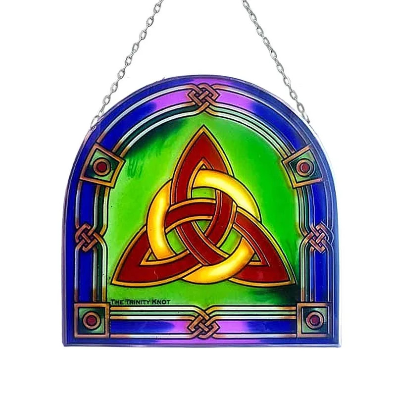 Welcome the warm sun rays in Celtic style with our Trinity Knot Suncatcher. This piece displays excellent craftsmanship as it is made with great attention to detail, from vibrant stained glass that will surely last for years to come. Stained glass is hand-painted, weather resistant, and highly durable and allows light to beautifully pass through.