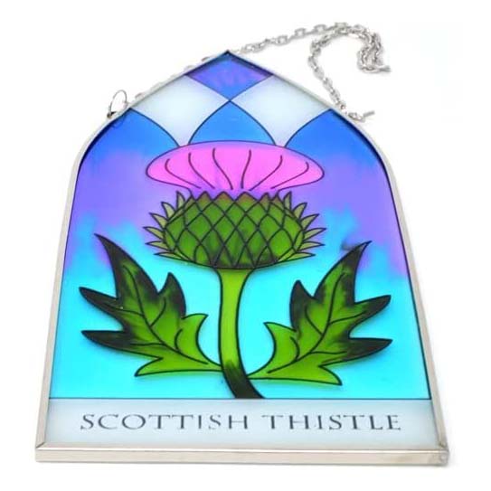 Bring some light and color into your house with our beautiful set of two Scottish window hanging decorations. They are made from stained glass that was masterfully painted in the Gothic style of medieval illuminated manuscripts. Historically, stained glass was used for window decorations in churches and temples. These stained glass panels are perfect for adorning your windows and enhancing your home decor.