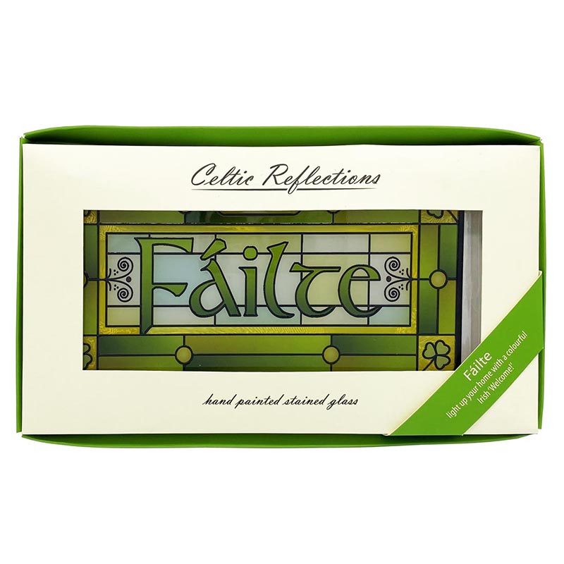 Light up your home with a colorful Irish welcome. Our Failte plaque is a hanging panel made of stained glass, a colored glass that guarantees durability, making the item last for generations. Timeless in appearance, the stained glass panel is hand-painted, featuring the famous Irish phrase – “Failte” which is translated as “Welcome”.