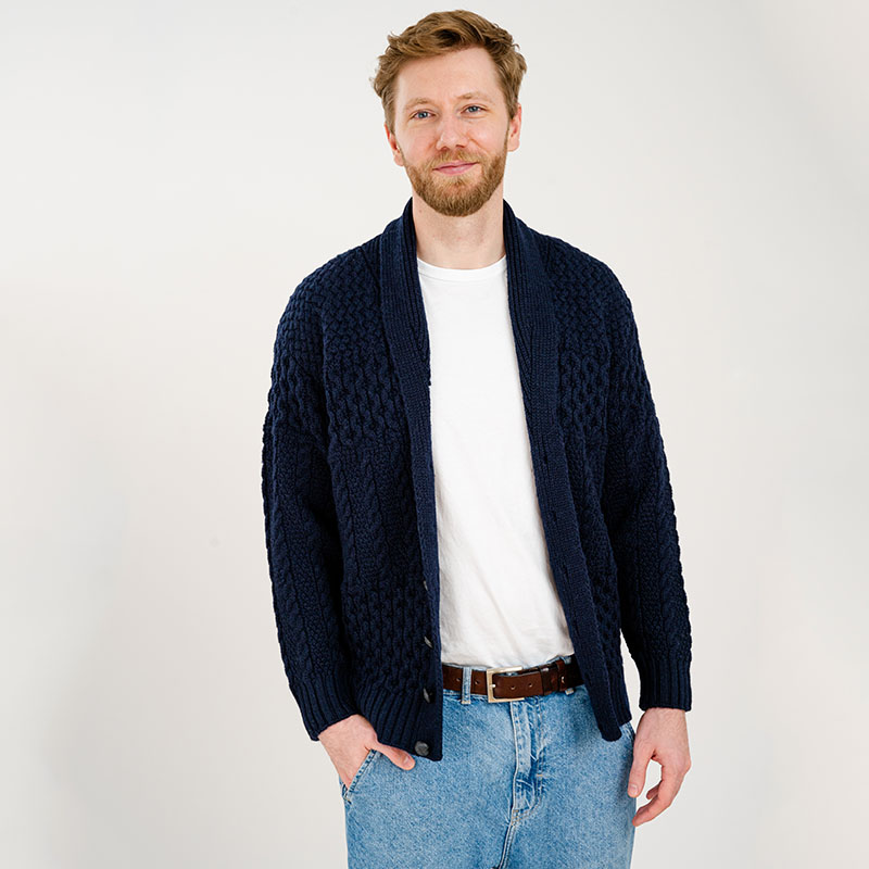 Besides its unmatched practicality, this cardigan also features unique Aran stitching patterns, widely known for their intriguing textures and meanings. These knit designs originate from the early 20th century and were incorporated into various pieces of knitwear by the locals of the Aran Islands, symbolizing moments of their daily life. For instance, the cable stitch incorporated in our cardigan’s design mirrors the ropes used by the Irish fishermen and suggests strength and steadiness, as they had to remain strong in order to safely return to their families. The honeycomb texture is an ode to the bee industry that operated on the Islands and represents the idea of sweet rewards that come after hard work. The moss and trellis stitches reflect the natural beauty of the Aran Islands, resembling the carrageen moss and dry stone-walled fields. What makes these stitches even more unique is their practical application, as they were primarily knit to add an additional layer of warmth and breathability. This men's Irish aran shawl neck cardigan is produced using the same special techniques, keeping you dry and comfortably warm all day.