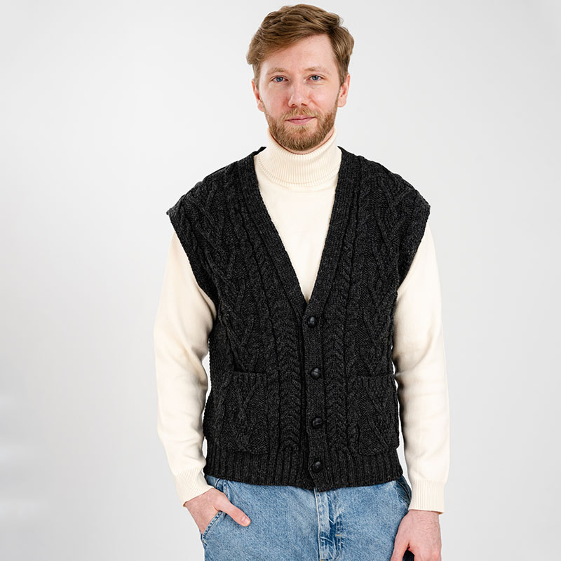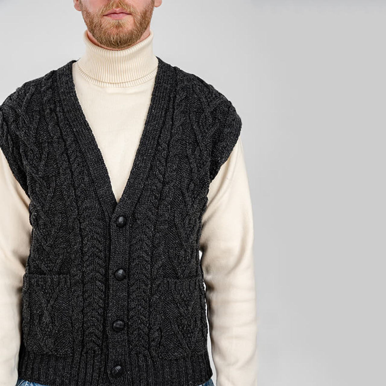 Our Men’s Aran Cardigan Vest combines traditional Irish craftsmanship with modern practicality, offering a timeless wardrobe staple that’s perfect for any occasion. Featuring the iconic Aran patterns - cable and moss stitching, this vest carries deep symbolism. The cable stitch, inspired by the ropes used by fishermen, represents strength and resilience, while the moss stitch stands for abundance and growth. Each stitch tells a meaningful story, connecting you to Ireland’s rich textile heritage and making this vest a unique piece of clothing.