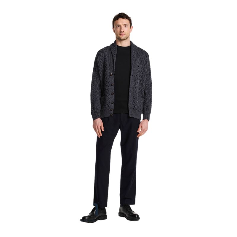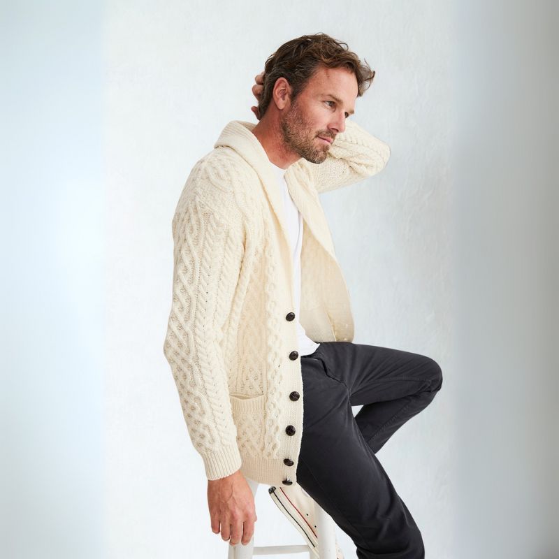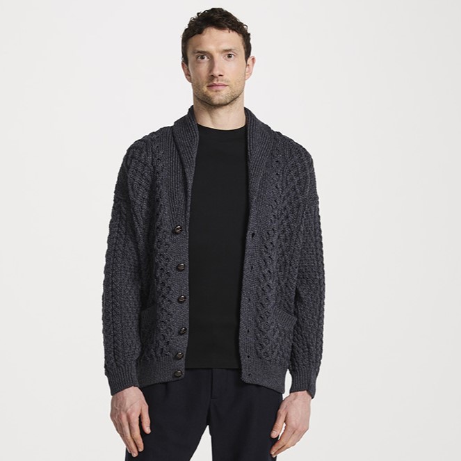 The shawl collar has a gentle drape that makes it look put together while the football buttons add a traditional touch. The two pockets are there for your hands when the air turns cold, or just to keep a phone or keys close by. Ribbed cuffs and hem pull it all together and help it keep its shape, even after years of wear.This cardigan is made in Ireland by skilled craftspeople who carry on a tradition that’s centuries old. Every piece feels personal, made with care and pride.