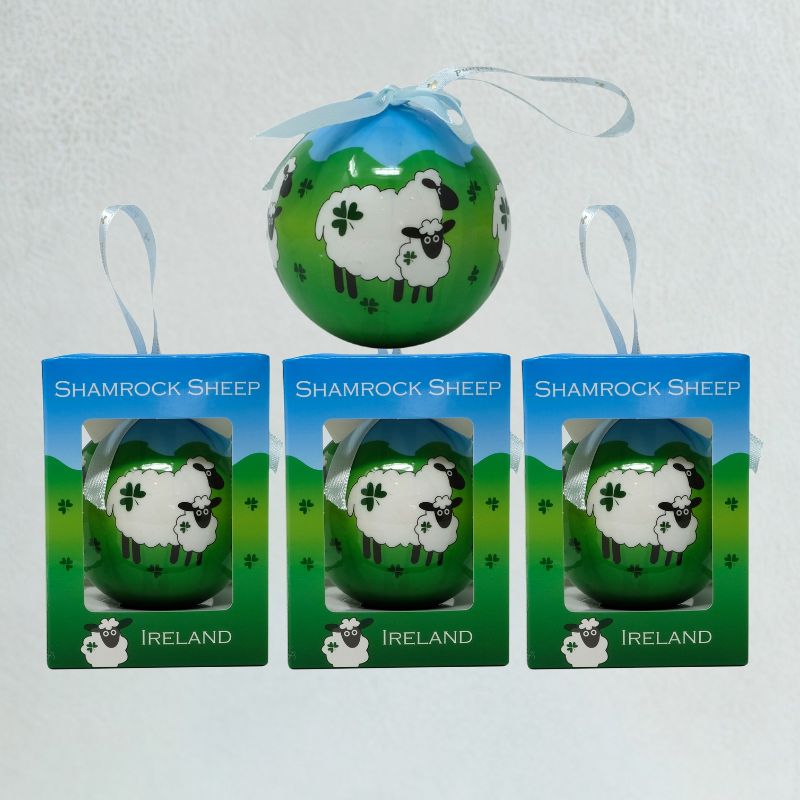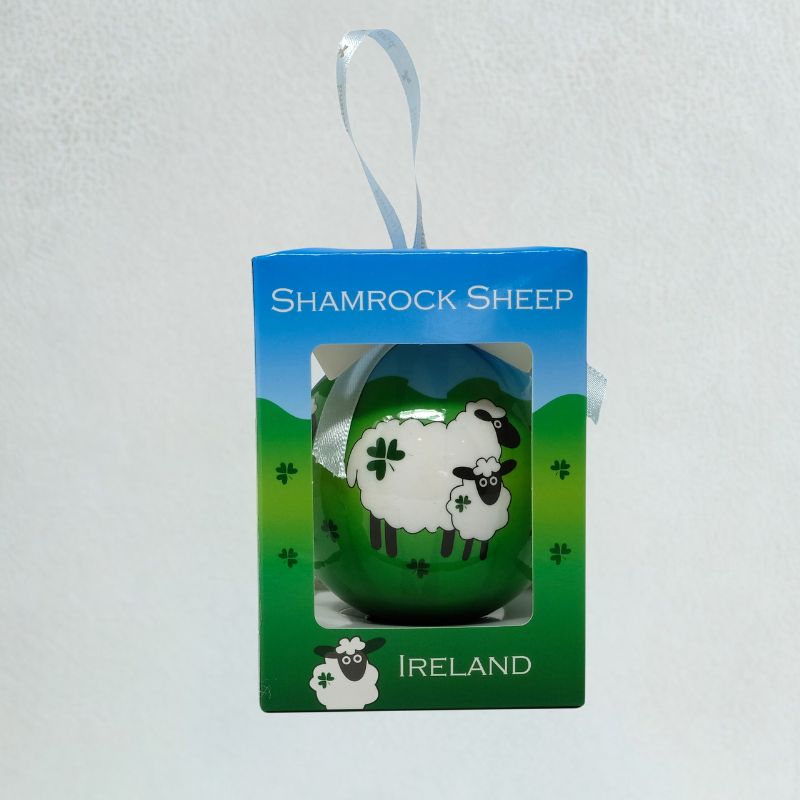 Make your Christmas tree extra special this holiday season with this Shamrock Sheep Bauble in a Gift Box. This ornament is a sweet reminder of the lush landscape and tranquil sheep on the country sides of Ireland. Two black sheep with white fur standing on green grass below a clear blue sky decorate the front of the piece. They are also adorned with and surrounded by floating shamrock flowers, which have been symbols of Irish pride for centuries.