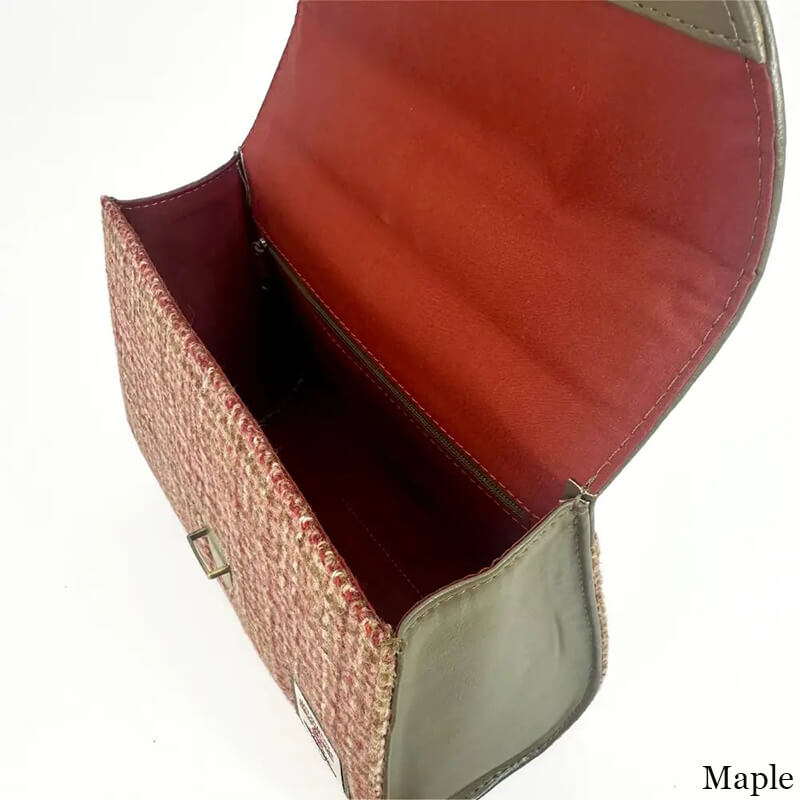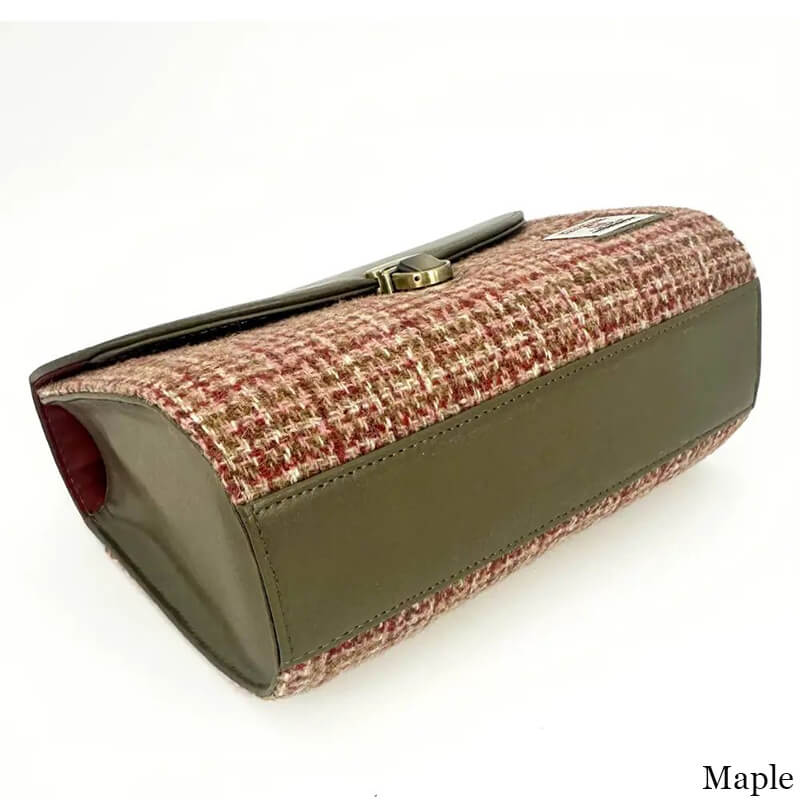The bag is sleek and compact, sized 8.66” L, 6.29” H, and 3.93” W. Don’t be fooled by the small-looking appearance, because the bag has plenty of room inside: one capacious main compartment with 2 additional pockets (one with zip closure and one open pocket). The bag is finely secured by a reliable tuck lock, ensuring your belongings are safely stored inside. Celebrate Scotland every day with our Harris Tweed mini bag for women!