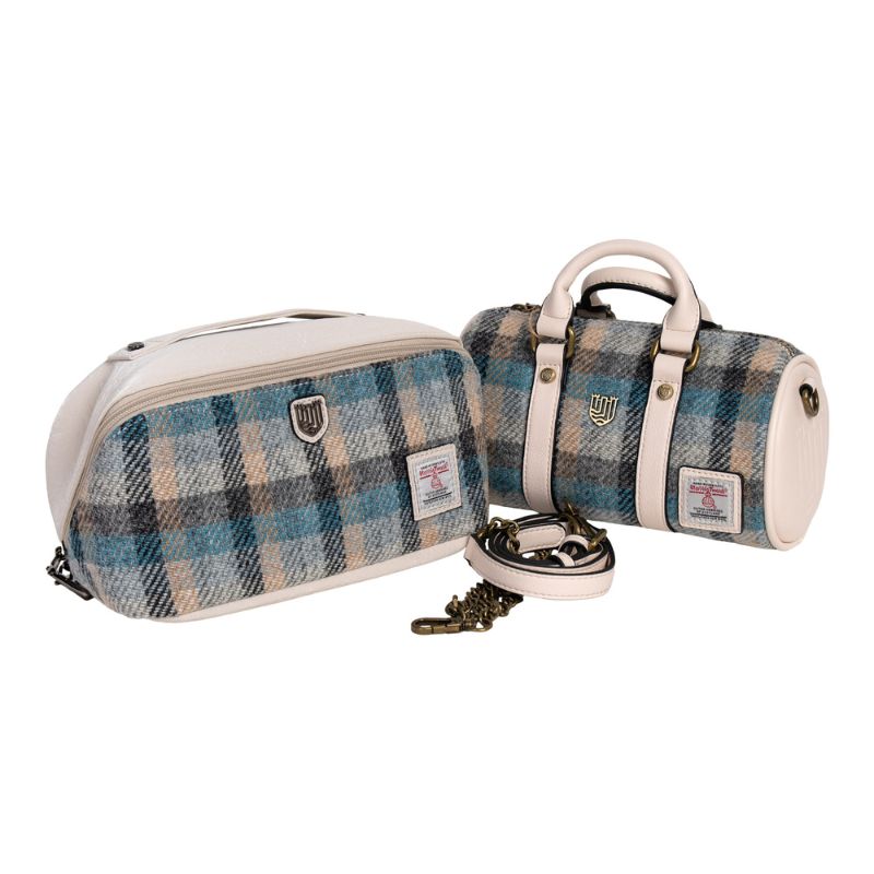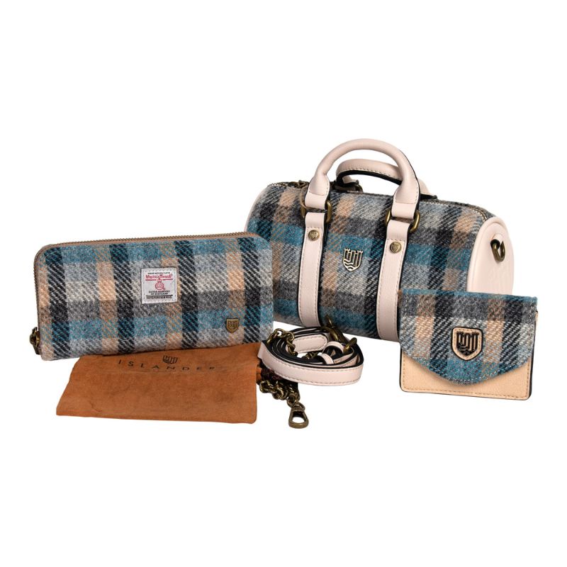 We’ve heard you’ve been searching for an authentic gift from Scotland. Check out our Handwoven Harris Tweed Duffel Bag Gift Set - Islander Tartan, a bundle that has everything you need! The centerpiece of the set is the handmade Scottish duffel bag, which you can pair and mix with a variety of matching products: a cosmetic bag, a long purse & small card case, a coin purse, or a beautiful ladies newboy hat.
