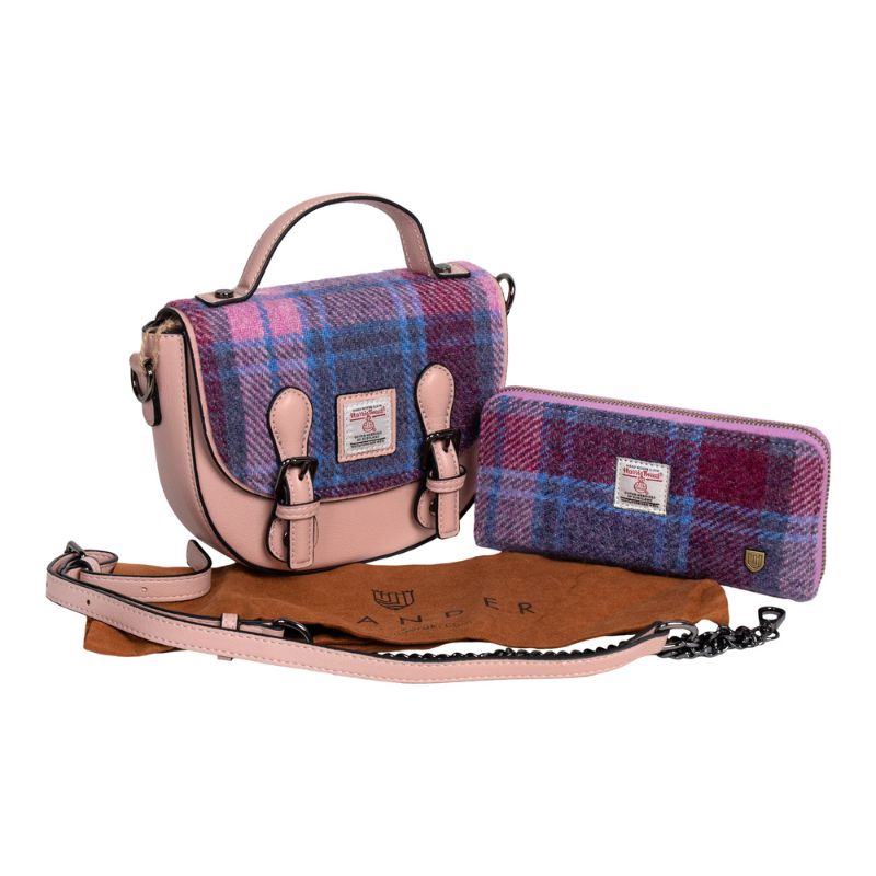 Calling out to fans of the beloved Harris Tweed! Our Islander Women's Mini Bag Bundle - Pink Tartan is specially curated just for you! The sets – wee satchel & mini cobble bag, wee satchel & toiletry bag, and mini cobble bag & long purse – are crafted using the finest Harris Tweed yarns, carefully handwoven by skilled artisans in their homes in the Outer Hebrides of Scotland. Each material is unique and truly special, with one-of-a-kind speckles of colors that add to its personality and charm.