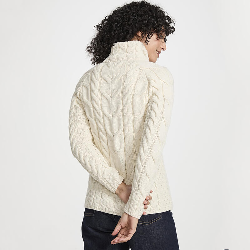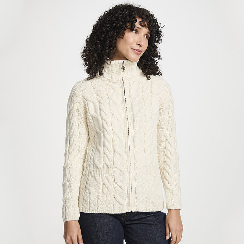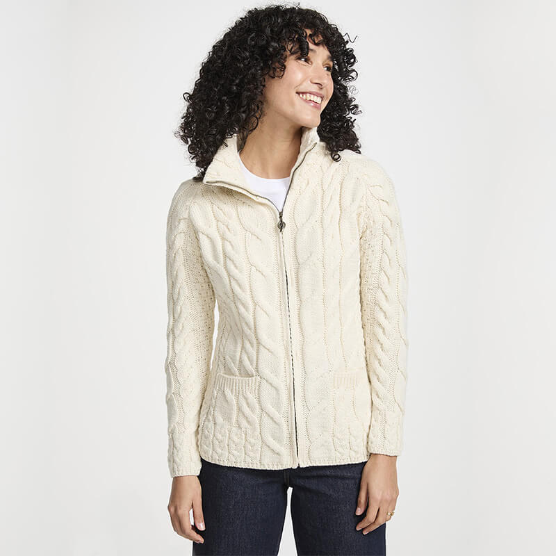 You can wear the classic collar up or down, one of the most standout features of the sweater. The zipper detail inclusion in the design and style of the jacket contrasts nicely with the cream color of the beautiful cardigan. Two deep warm pockets for cold hands are the perfect finishing touch to the sweater, keeping you stylish and cozy. Our gorgeous sweater incorporates the use of Aran stitch patterns in its design and style. The Aran style patterns have their roots in Ireland, and their use in the cardigan is a celebration of the rich and vast Irish cultures and traditions.