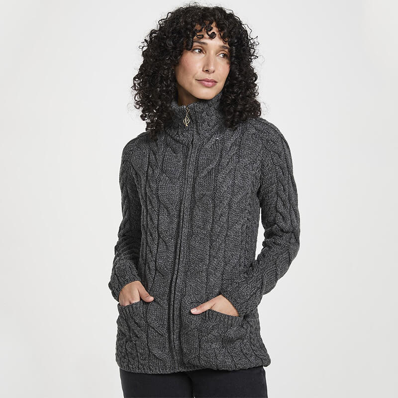 Our marvelous Aran cardigan from Aran Woollen Mills stands out as the perfect wear to keep the cold at bay, as you maintain that sleek, chic, feminine look. It will be the best addition to your winter wear collection and stands as the perfect gift to your loved ones, to show that you are considerate and caring. The Aran sweater for women is built to last and is durable, warm, and comfortable. The style and design Our beautiful Aran cardigan comes from the thick, super-soft, super-cozy 100% pure Supersoft Merino wool, a product of Ireland. The Merino wool offers a silky, smooth texture that is cozy to touch, providing comfort and warmth, to help you beat the cold spells. The craftsmanship that has gone into the design of this marvel is outstanding and unique.