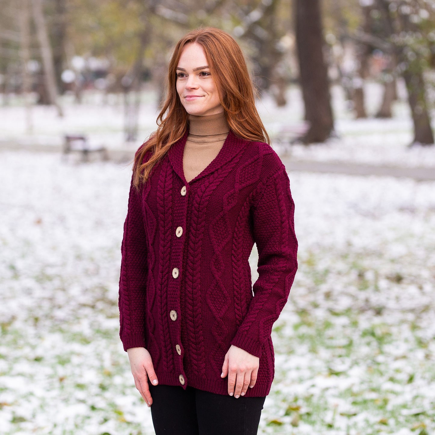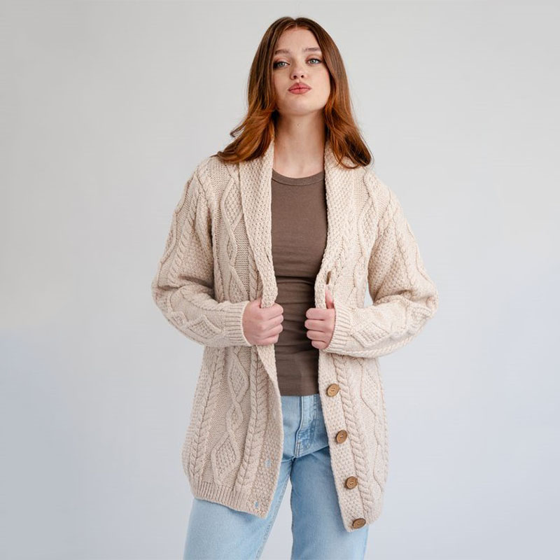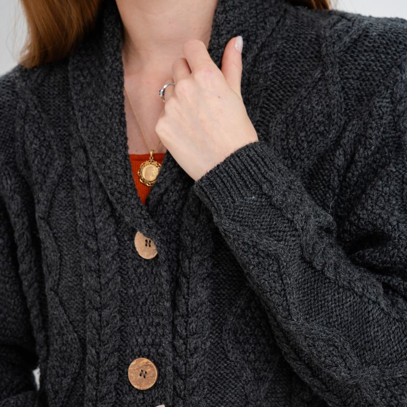 The shawl neckline adds a stylish touch, making it ideal for layering, while the front opening with coconut buttons, as well as the ribbed cuffs & hemline provide a refined finish. Whether you're dressing up or keeping it casual, this cardigan blends tradition, craftsmanship, and that charm characteristic to Irish fashion perfectly.