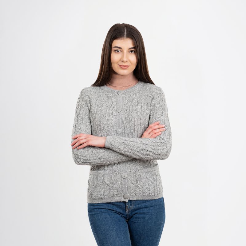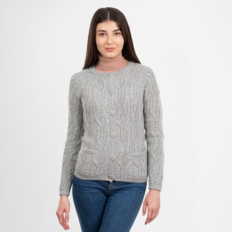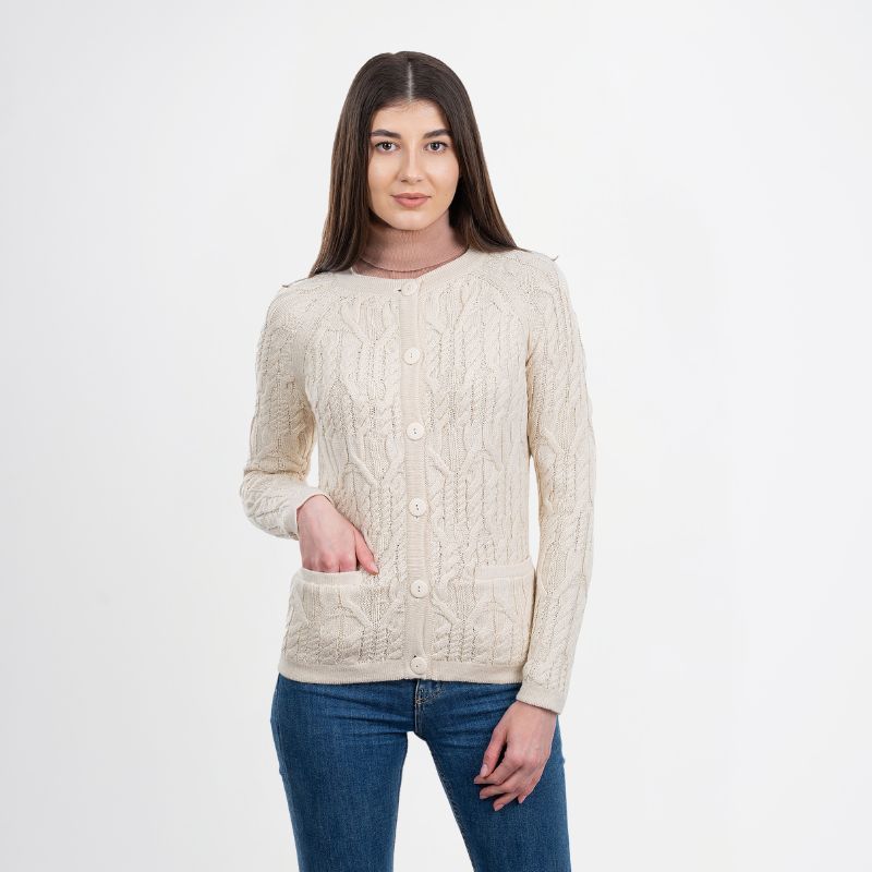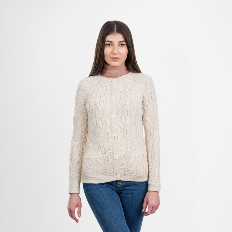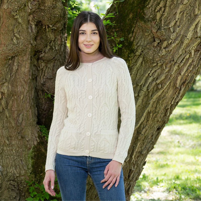 A perfect addition to your winter wardrobe, our Cable Knit Wool Ladies Irish Button Cardigan was made in Ireland by leading knitwear producer Saol. The company takes traditional Irish sweater designs, translates them into contemporary styles, and makes them accessible worldwide. The traditional fisherman’s sweater is an iconic part of the Irish imagery, and this lovely and feminine Aran cardigan is a perfect interpretation for the modern wearer. Thick, detailed cables decorate the body of this raglan-sleeved sweater, paying homage to the designs of the original Aran knits. In the late 19th century, fishermen on Ireland’s Aran Islands began producing heavy sweaters to keep them protected during their long days at sea. They used wool from the island’s sheep, which was thick, scratchy, and full of lanolin, an oily substance that made the garments repel water. Some say the different knit patterns used in the sweaters even contain unique meanings.