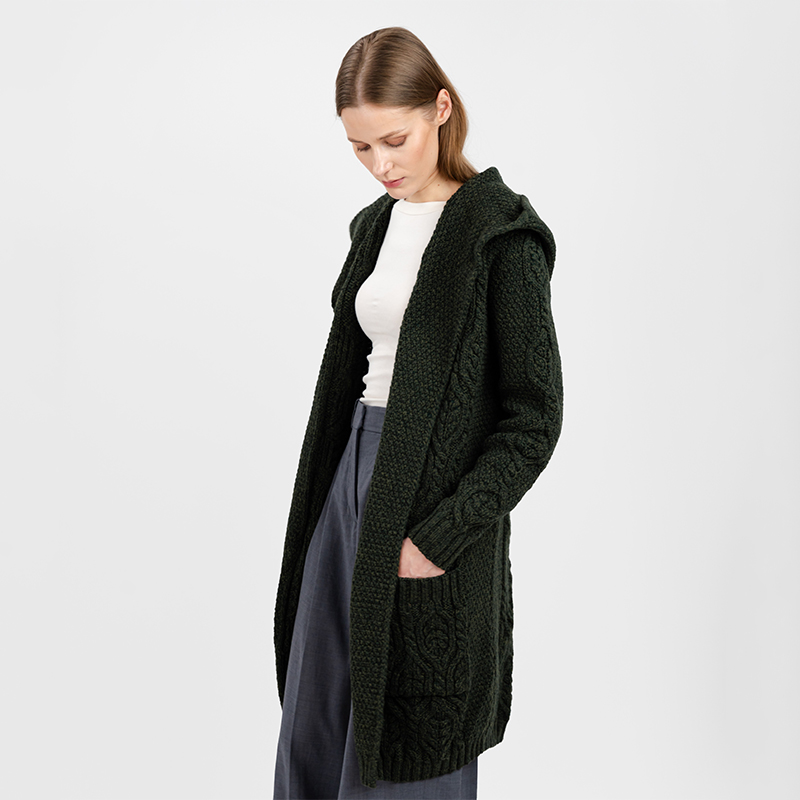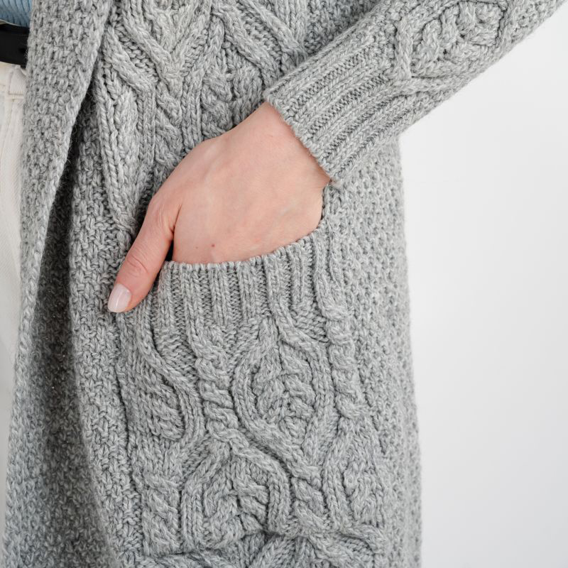 The models were first used to design fishermen's garments to keep them warm during their fishing voyages. The first garments that incorporated the Aran patterns were water resistant, as a result of the intricate craftsmanship that went into their design. The Aran stitching patterns are the pride of Ireland and as a celebration of the country’s rich traditions and culture. You can find the Aran designs in clothing spread all over the world, known from their unique, original, and intricate designs. Our gorgeous jacket combines two intricate Aran patterns in its design- Cable and Honeycomb pattern knits, giving it an authentic Aran Islands style. The stitching adds texture and dimension to our plush jacket, giving you comfort and warmth as you step out in style.