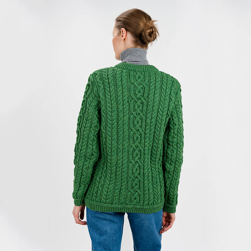 Experience the timeless elegance and luxurious comfort of this Ladies Traditional Aran Cardigan. This cardigan features traditional Aran cable and moss stitching, each with rich symbolism rooted in Irish culture. The intricate cable patterns symbolize the fisherman's ropes, representing hope and good fortune. Moss stitching signifies the fields of the Aran Islands, a tribute to Ireland's natural beauty and rugged landscapes. These stitches enhance the cardigan's aesthetic appeal and also add texture and depth, showcasing the artistry involved in its creation.