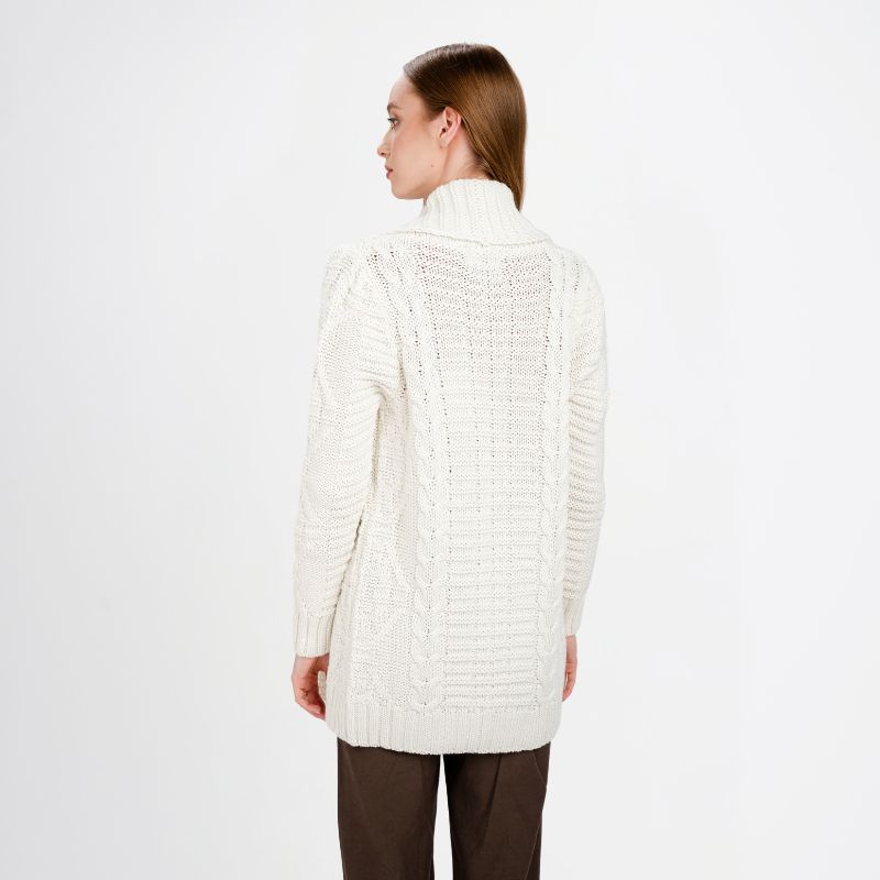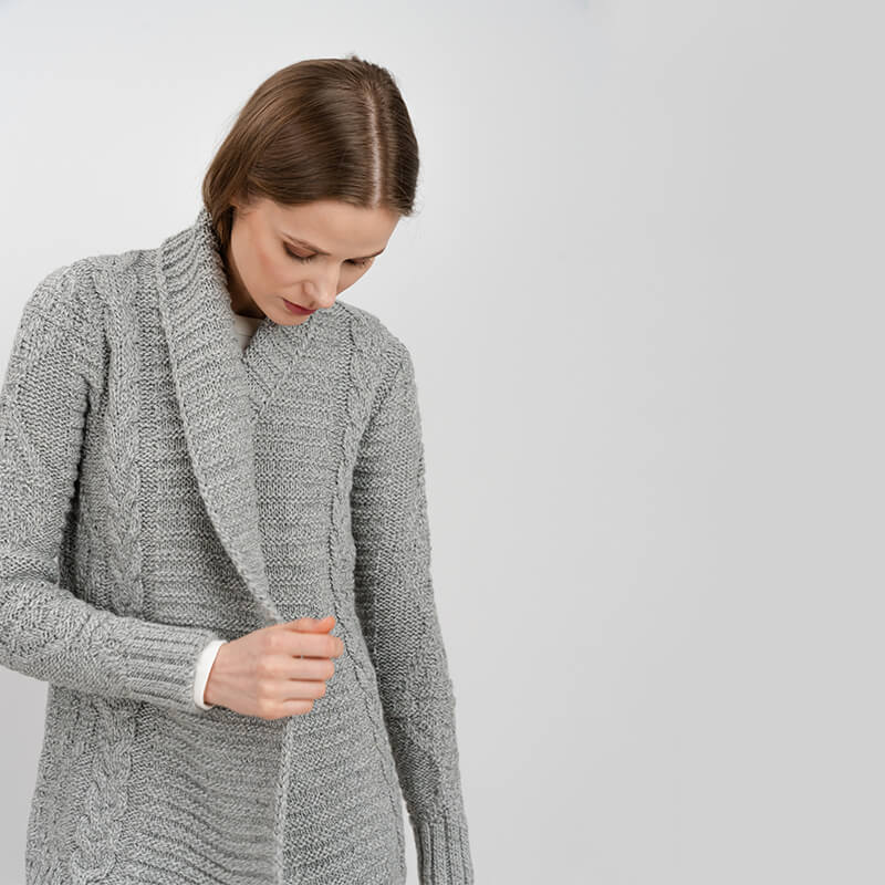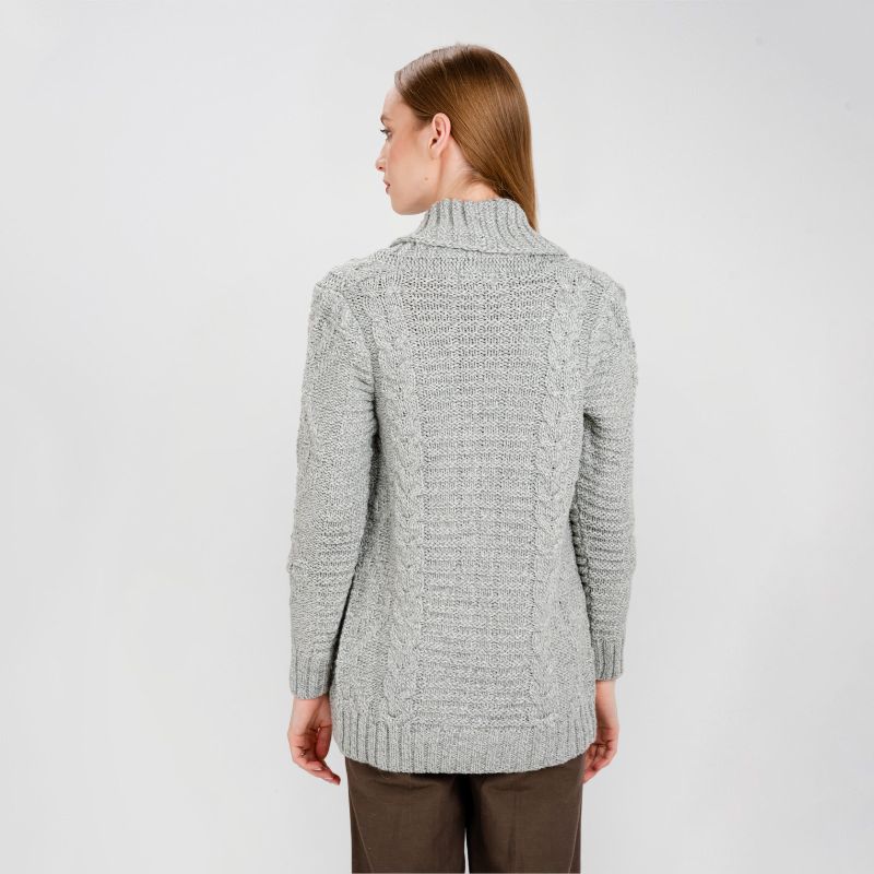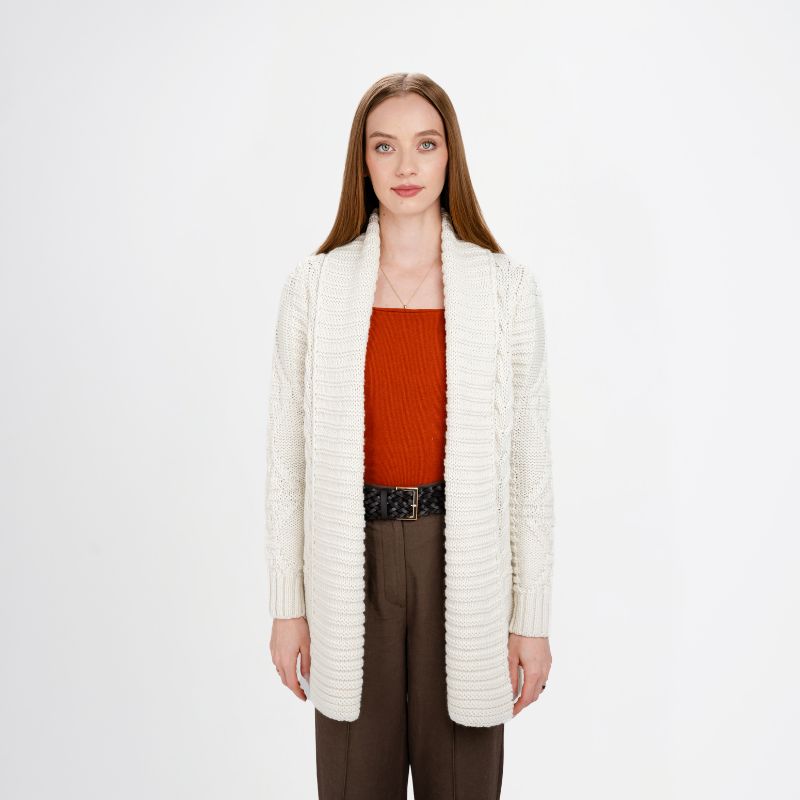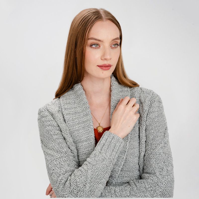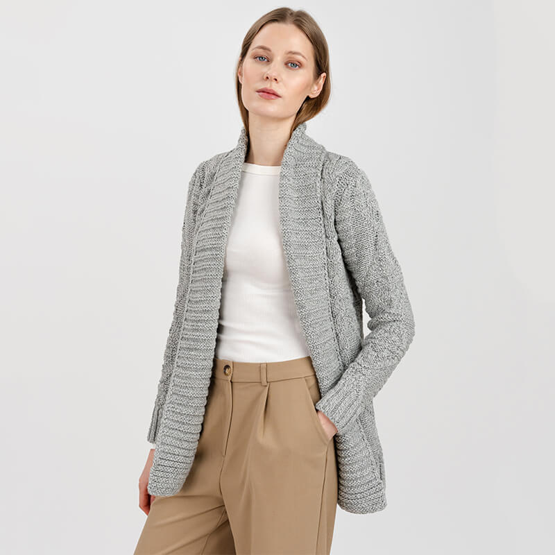The cardigan features dual cable and diamond knit patterns, which date back centuries and are inspired by the traditional knitting patterns found on the Aran Islands off Ireland’s west coast. Originally used to keep fishermen warm with extra bulk in the sweaters, today, they symbolize the ropes of these fishermen and the stone fields of Ireland. Together, they represent the hope for good fortune and the promise of wealth.