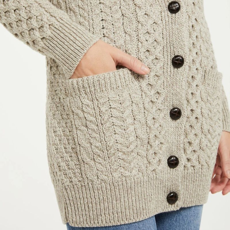 For a classic Aran cardigan that will keep you warm through the fall and winter with tradition, style, and quality, you’ll adore our Women's Long Aran Knit Cardigan from the folks at Boyne Valley Knitwear. Traditional designs paired with modern details make this piece truly a one-of-a-kind cardigan that you will love to wear all fall and winter long. Crafted in Ireland from 100% ultra-soft Merino wool, you will love the way our cardigan feels against your skin. A high-quality textile, Merino is gentle to the skin while still being strong and durable enough to keep you warm against the chill of winter.