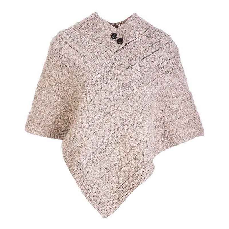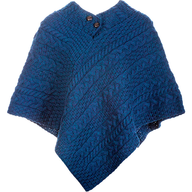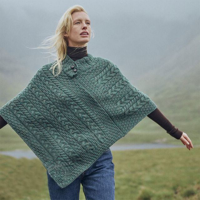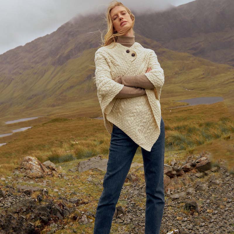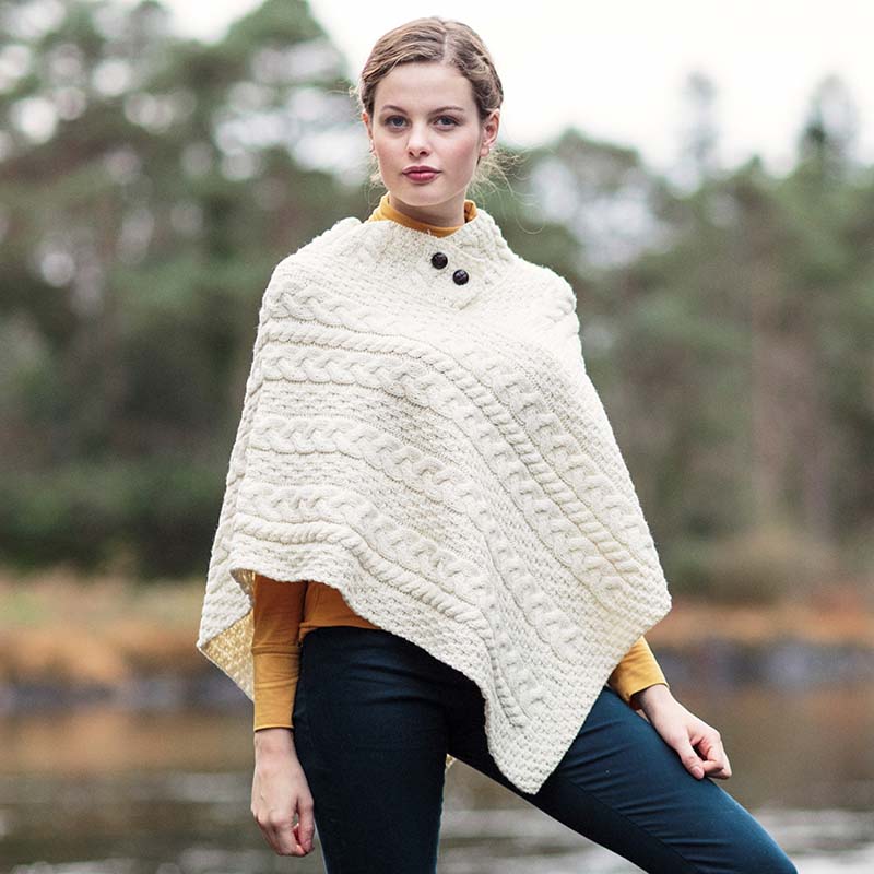 Aran stitching is a uniquely Irish artform, born in the Aran Islands at the mouth of Galway Bay. The different knitting stitches that form the different distinct patterns in the wool are inspired by generations of Aran fishermen, their families, and the history of their lives at sea. Our Traditional Knitted Ladies Poncho features classic cable stitching, reminiscent of the ropes that fishermen use to pull in their catches and symbolic of safe voyages and good days at sea. Basket stitch patterns reference fishermen’s baskets, with hopes for fruitful catches. When you wear our poncho, you are wrapped warmly in wishes for good fortune!