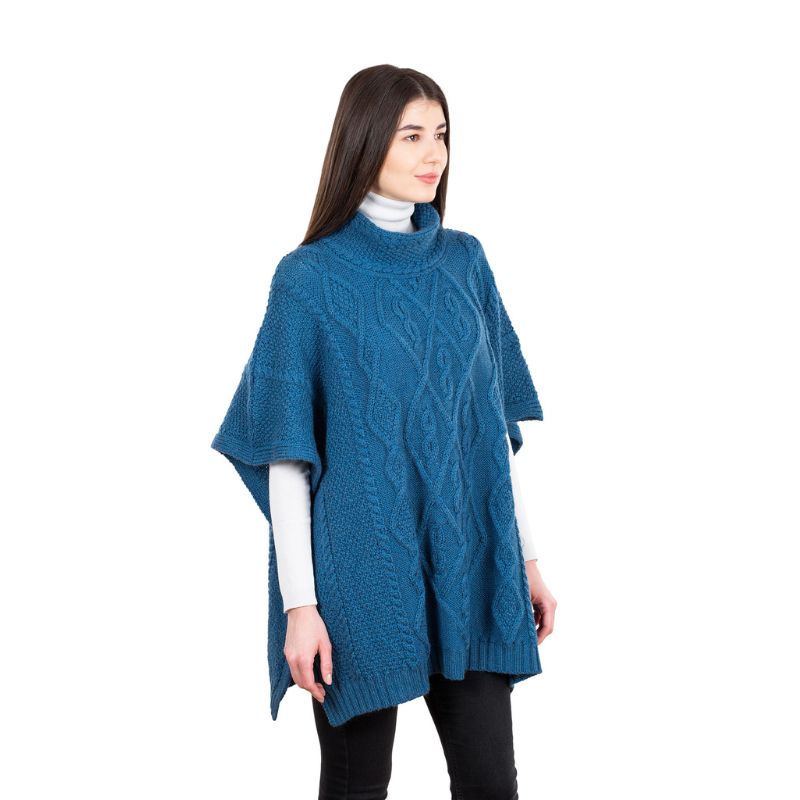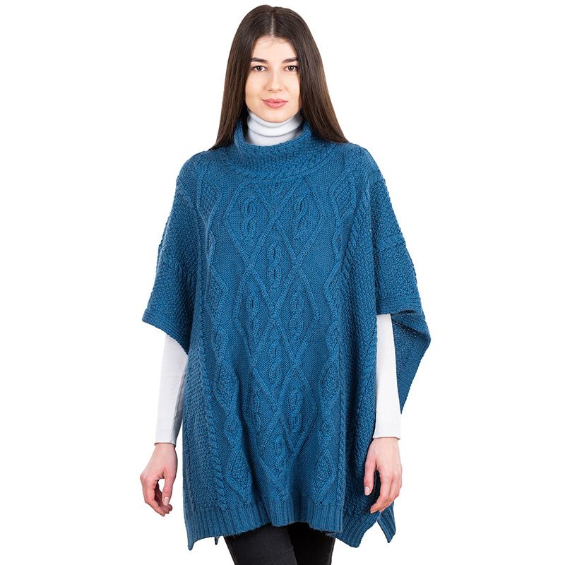 The intricate Aran stitches, reminiscent of the ropes used by Aran fishermen, exude a sense of authenticity and cultural significance. The cable knitting represents the fishermen's unwavering hope for abundant catches and bountiful harvests, while the diamond stitch mirrors the fields that once sustained the lives of Aran Islanders. The moss stitch, a symbol of prosperity and well-being, further enhances the poncho's cultural significance. The high funnel neck collar provides unparalleled warmth and protection against the elements, shielding your neck and décolletage from the chill. This timeless design element lends a touch of sophistication and elegance to the poncho, making it a versatile piece suitable for a variety of occasions.