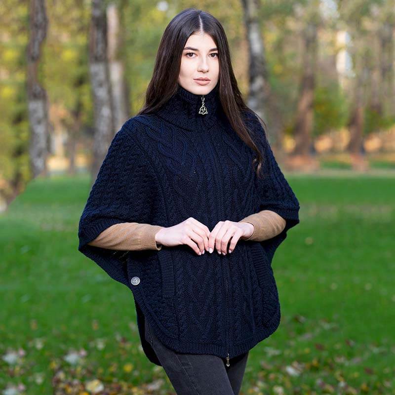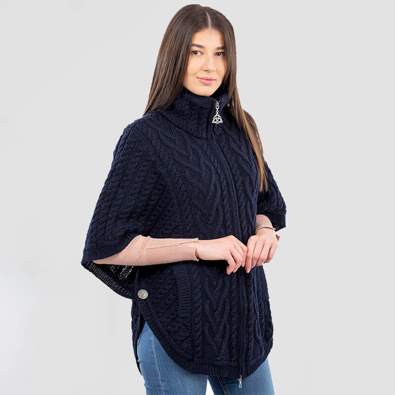 This gorgeous Saol Funnel Neck Poncho Jacket is the best of both worlds — part jacket, part poncho, it gives you the freedom of movement of a poncho with its half sleeves and open bottom design while affording the comfort of a jacket with its full zipper front and two side pockets for keeping your hands warm or storing keys and cards. The zipper is topped with an elegant Trinity knot zipper pull.