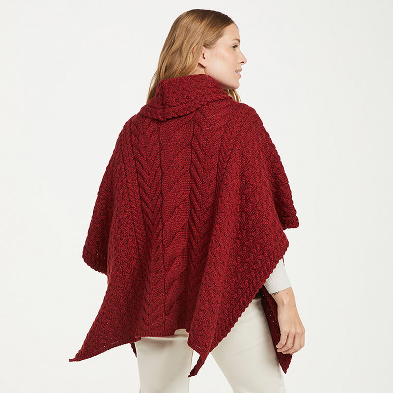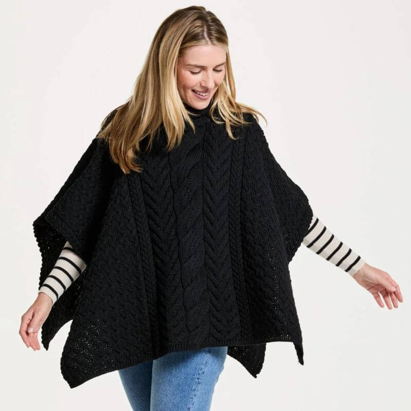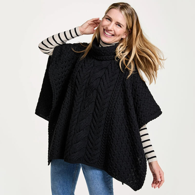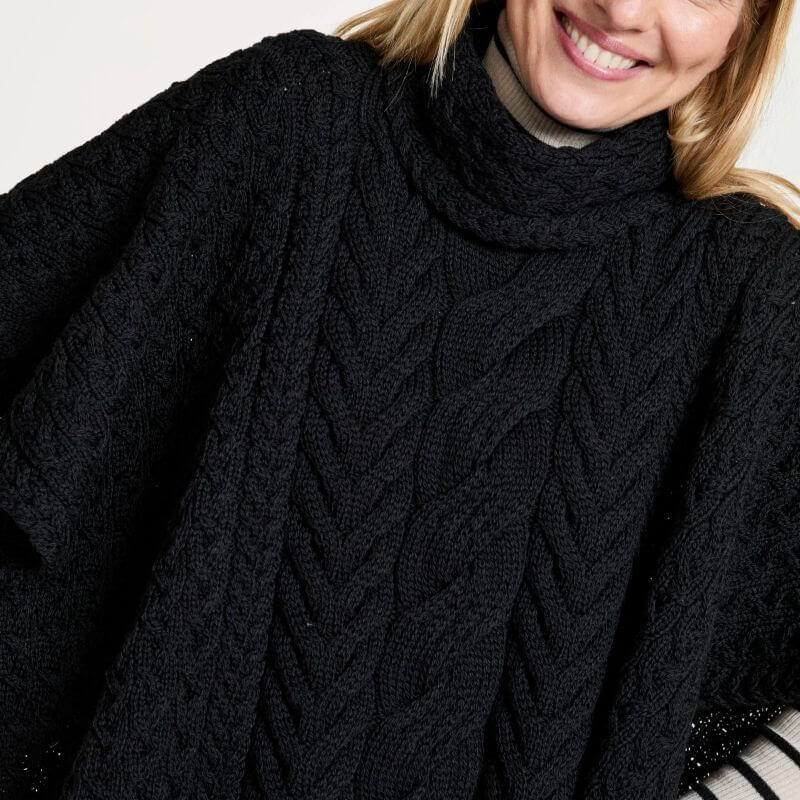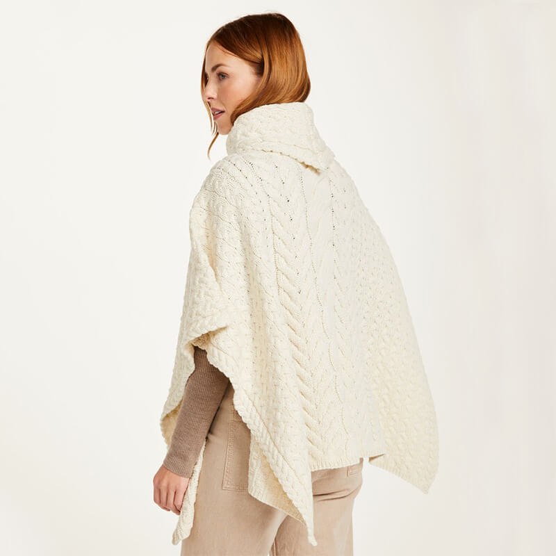 If you love the feel of a big cozy sweater, our SuperSoft Merino Wool Poncho with Cowl Neck is exactly what you’re looking for. Perfect for layering, you will turn heads in our poncho whether you dress it up or down. Made in Ireland from 100% supersoft merino wool, you will love the way our poncho feels against your skin. Incredibly soft and touchable, you will feel like you are wrapped in luxury each time you put it on. Distinctive Aran stitching lends our gorgeous poncho a super special pattern that channels Irish heritage and history all at once. The unique cable stitching provides depth, texture, and movement that is sure to get you noticed. The poncho silhouette of this sweater is an edgy way to finish off just about any look you’ve got in your wardrobe.