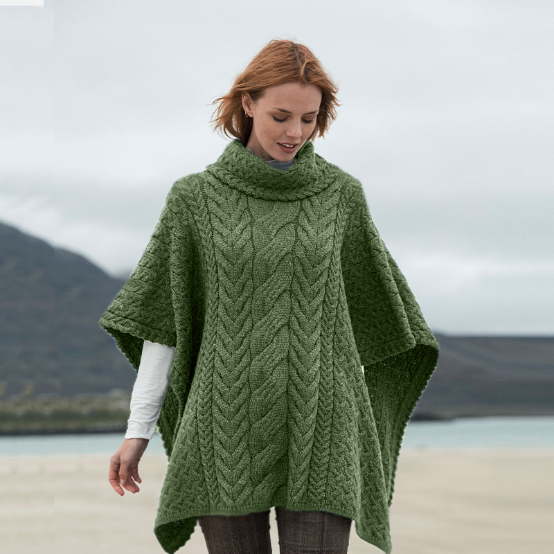 You can easily pair it with just about everything you have in your wardrobe, without fear of clashing colors.You can wear it with long sleeves, short sleeves, leggings, slacks, skirts, or dresses—the sky is the limit when you have a stunning classy piece like this poncho! 100% Merino Wool Merino wool is the gold standard when it comes to textiles. Soft, absorbent, and all-natural, this type of wool is perfect for fabrics and knits that are made into clothing. If you have not had the privilege to experience merino yet, you are in for a treat. Merino’s small fibers give it the bend and twist that makes it perfect for all kinds of apparel. The softer nature of merino wool means that it does not poke and scratch at the skin, so you can wear it with confidence--no uncomfortable itchiness. Only soft, luxurious comfort. Aran Stitching Aran stitching is a uniquely Irish artform, born in the Aran Islands at the mouth of Galway Bay.